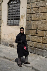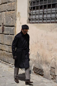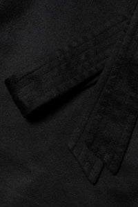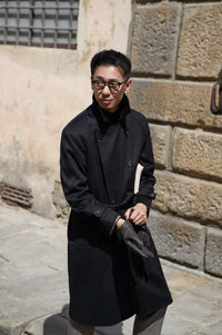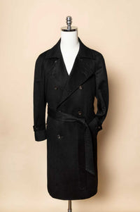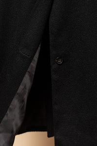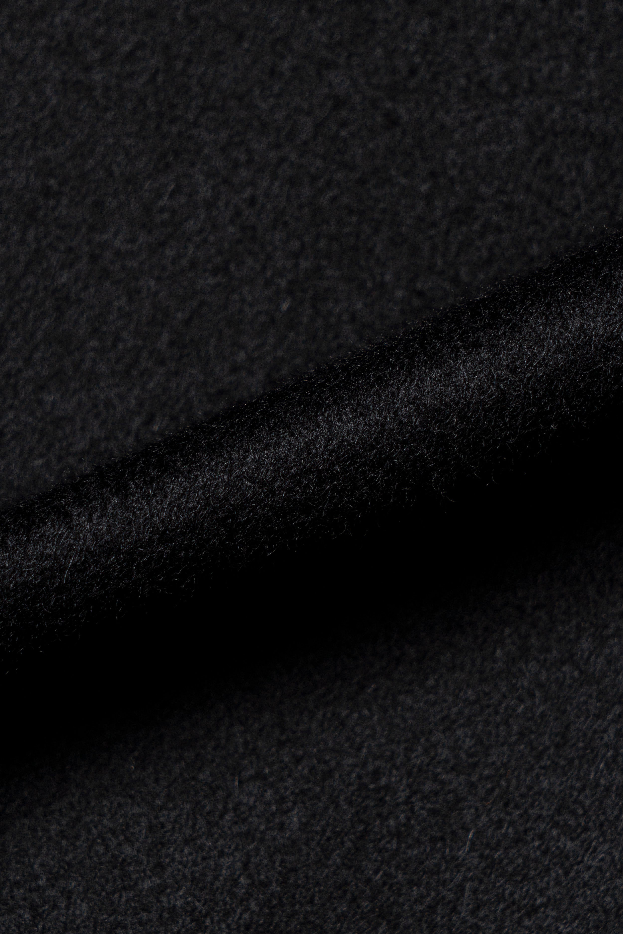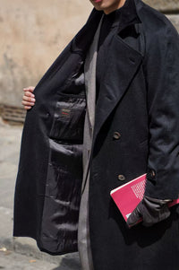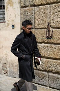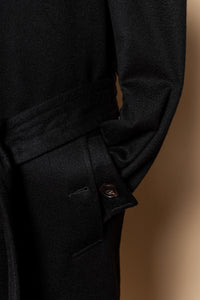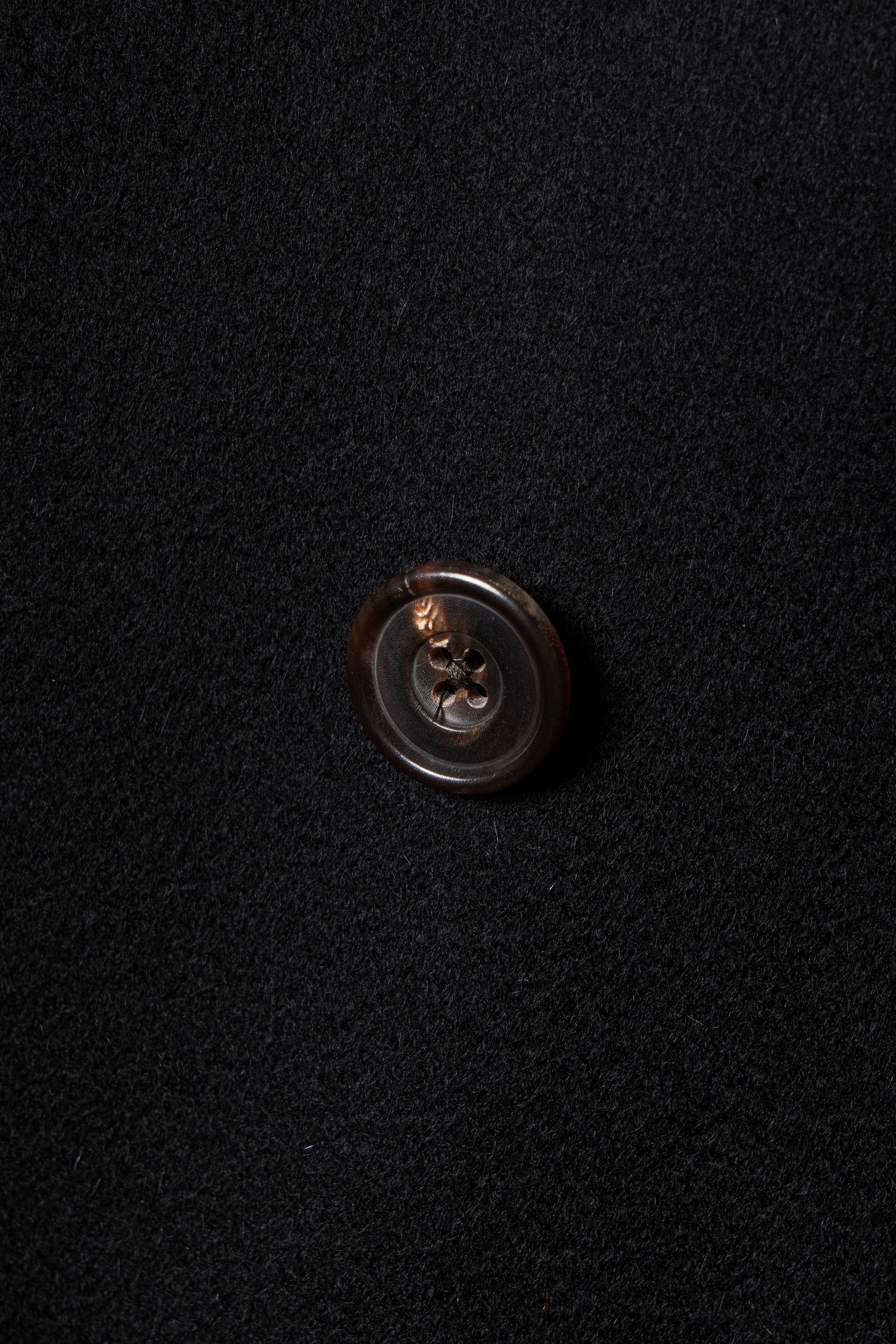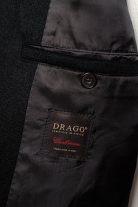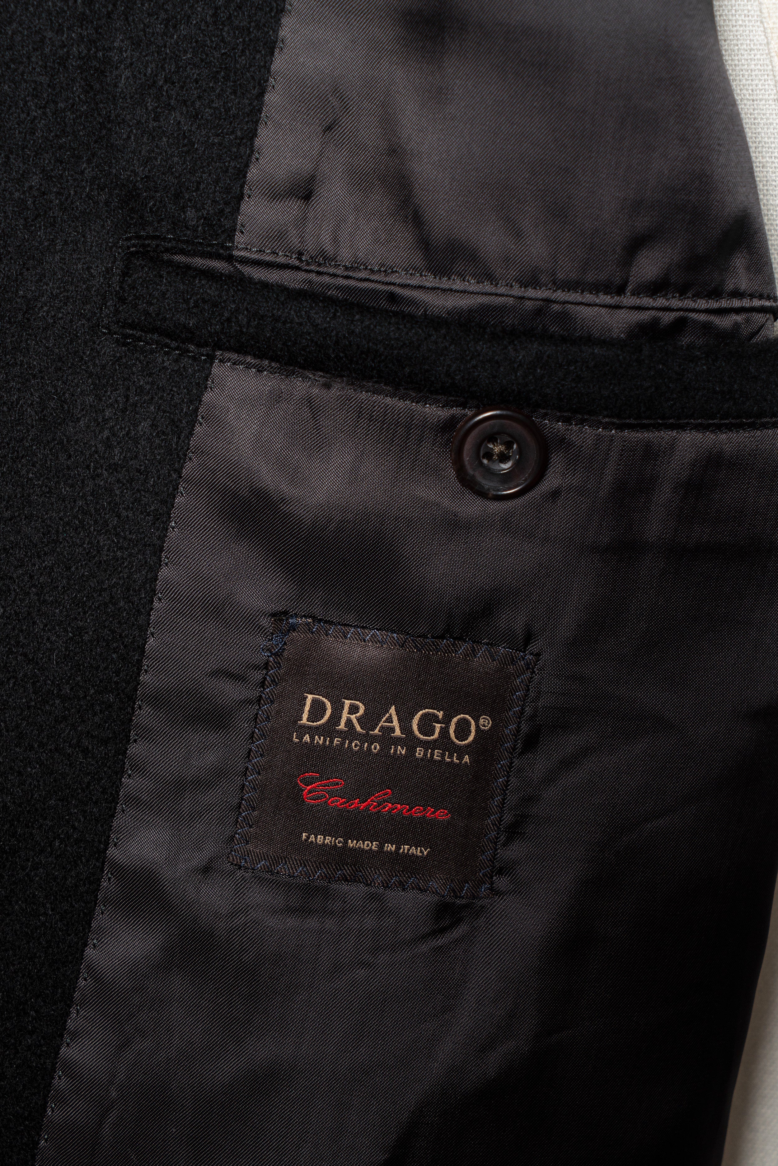 • Tailored in Italy from Drago’s distinguished “Cashmere” line, this black Balmacaan coat delivers refined minimalism and luxurious touch. The double-breasted silhouette with raglan sleeves and clean collar ensures smart layering over tailoring, while the pure cashmere fabric offers exceptional hand-feel and subtle drape.
