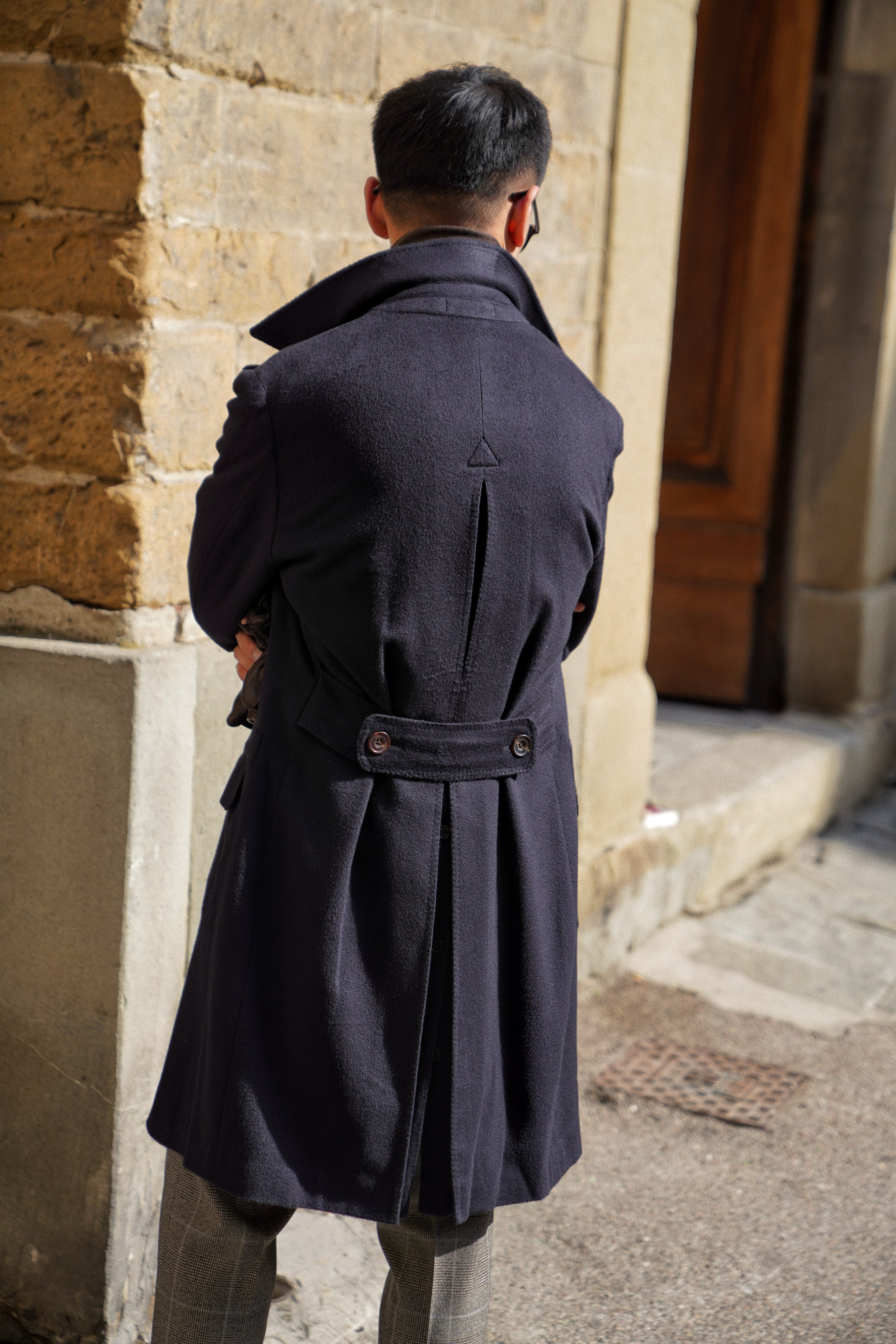 The Navy Cashmere Ulster Coat is crafted from pure Cerruti cashmere, woven in Biella, Italy. This timeless Ulster silhouette features wide lapels, a double-breasted front, and a belted back for a refined yet relaxed structure. Luxuriously soft and naturally insulating, it offers effortless sophistication from city streets to evening occasions.