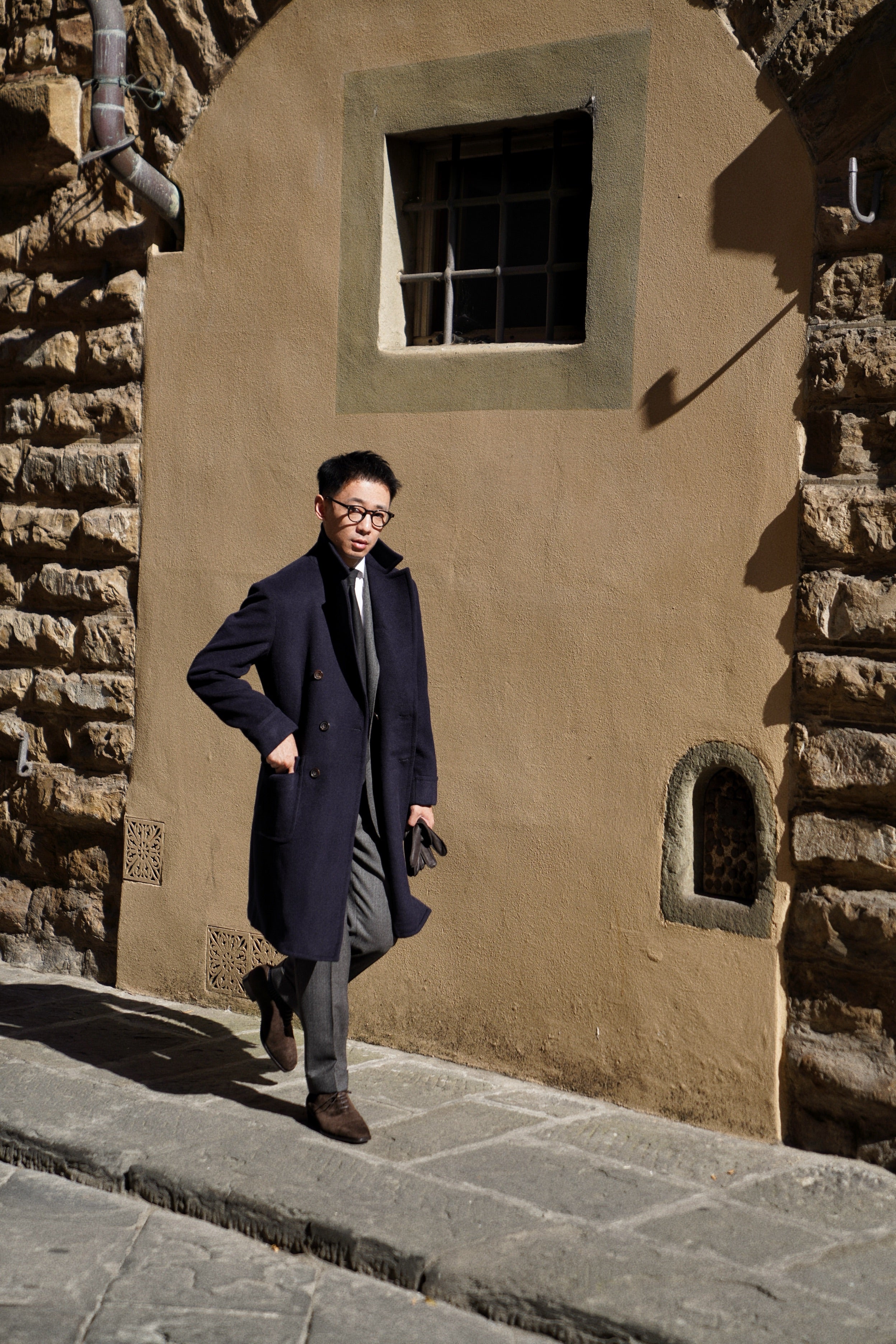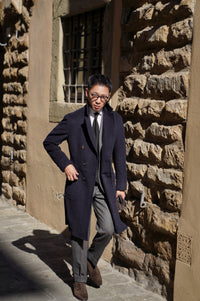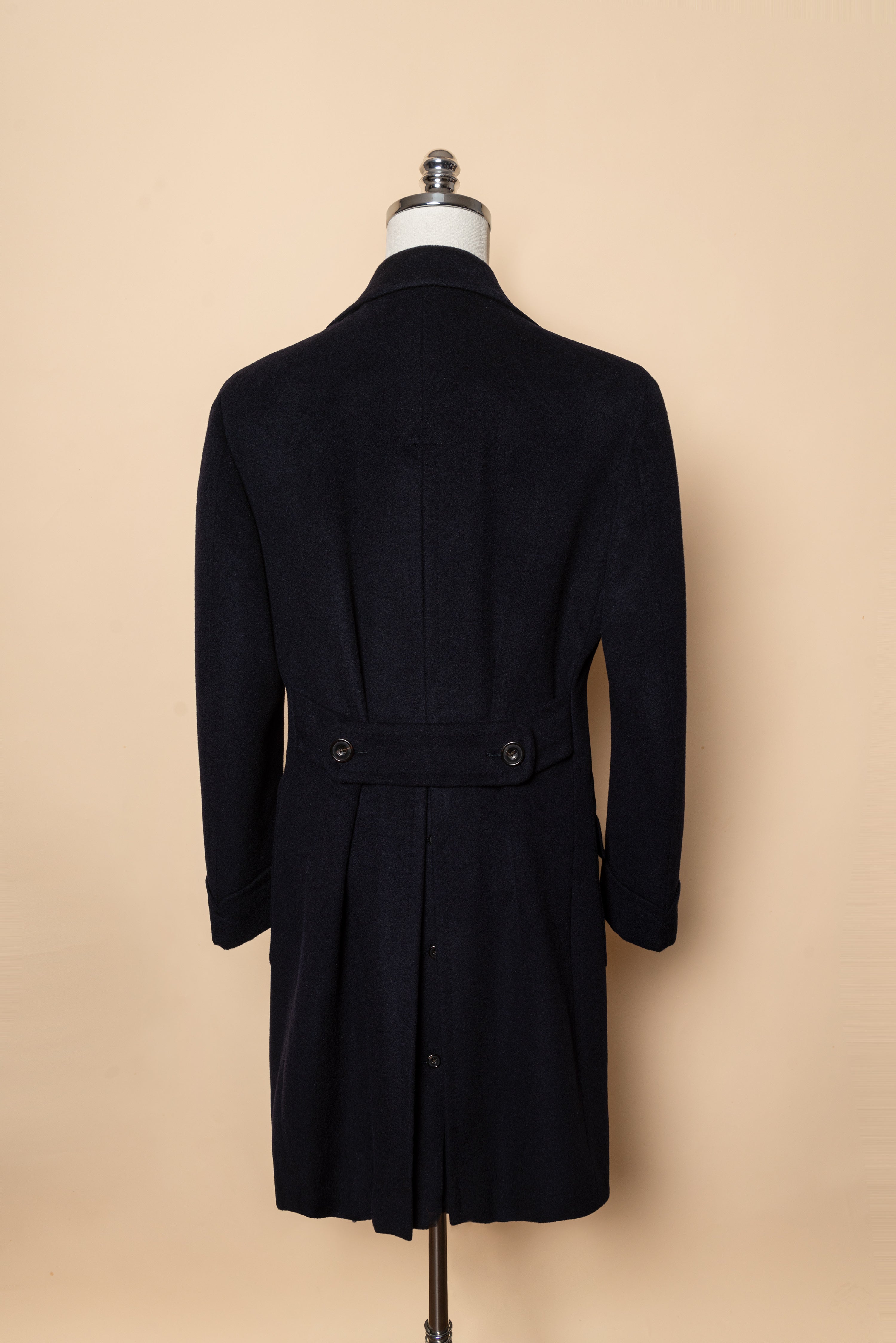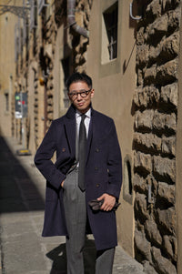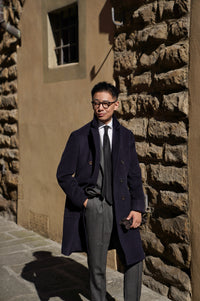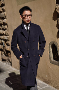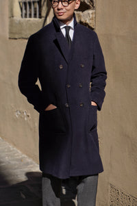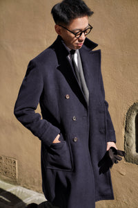 The Navy Wool Ulster Coat is crafted from heavy pure wool, offering warmth, durability, and a refined drape. Designed with the classic Ulster silhouette, it features a double-breasted front, broad lapels, and a belted waist for a distinguished look. Its deep navy tone enhances versatility, making it a timeless outerwear piece that balances traditional elegance with modern sophistication.