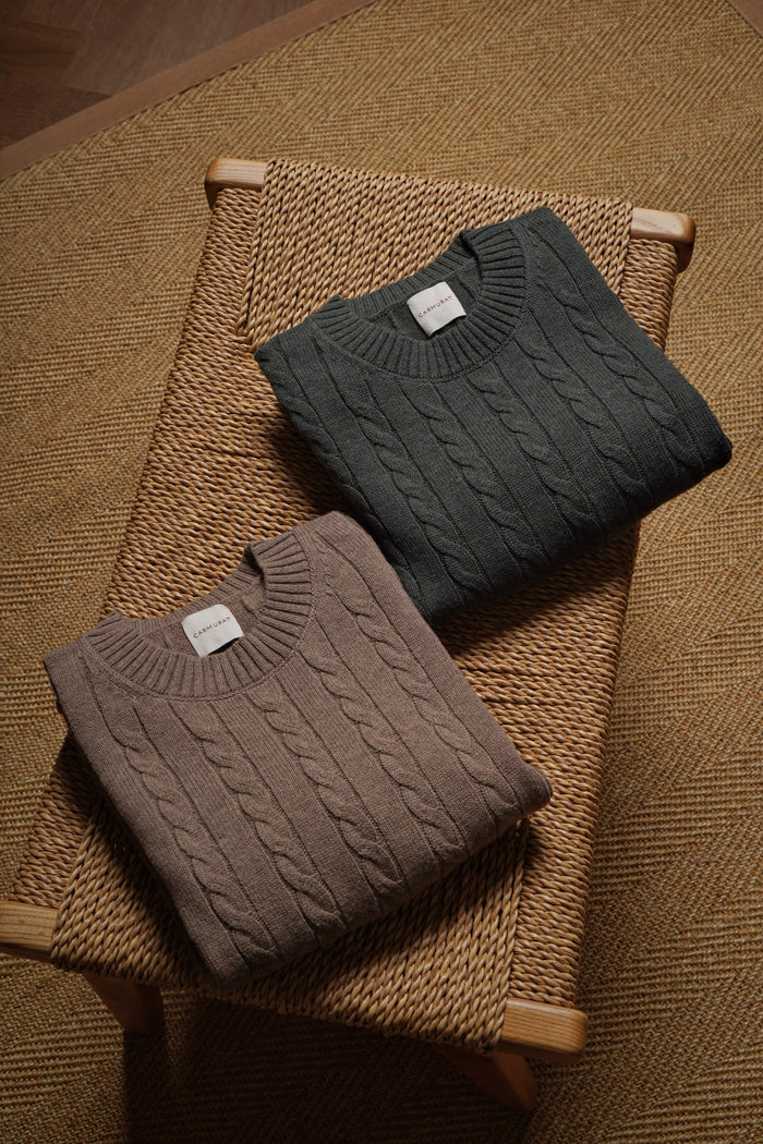 Forest / Taupe Crew Neck Cable Knit Jumper