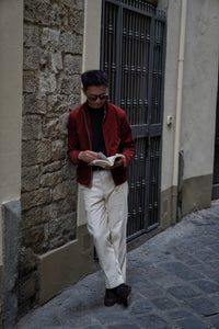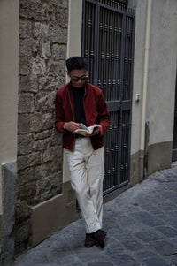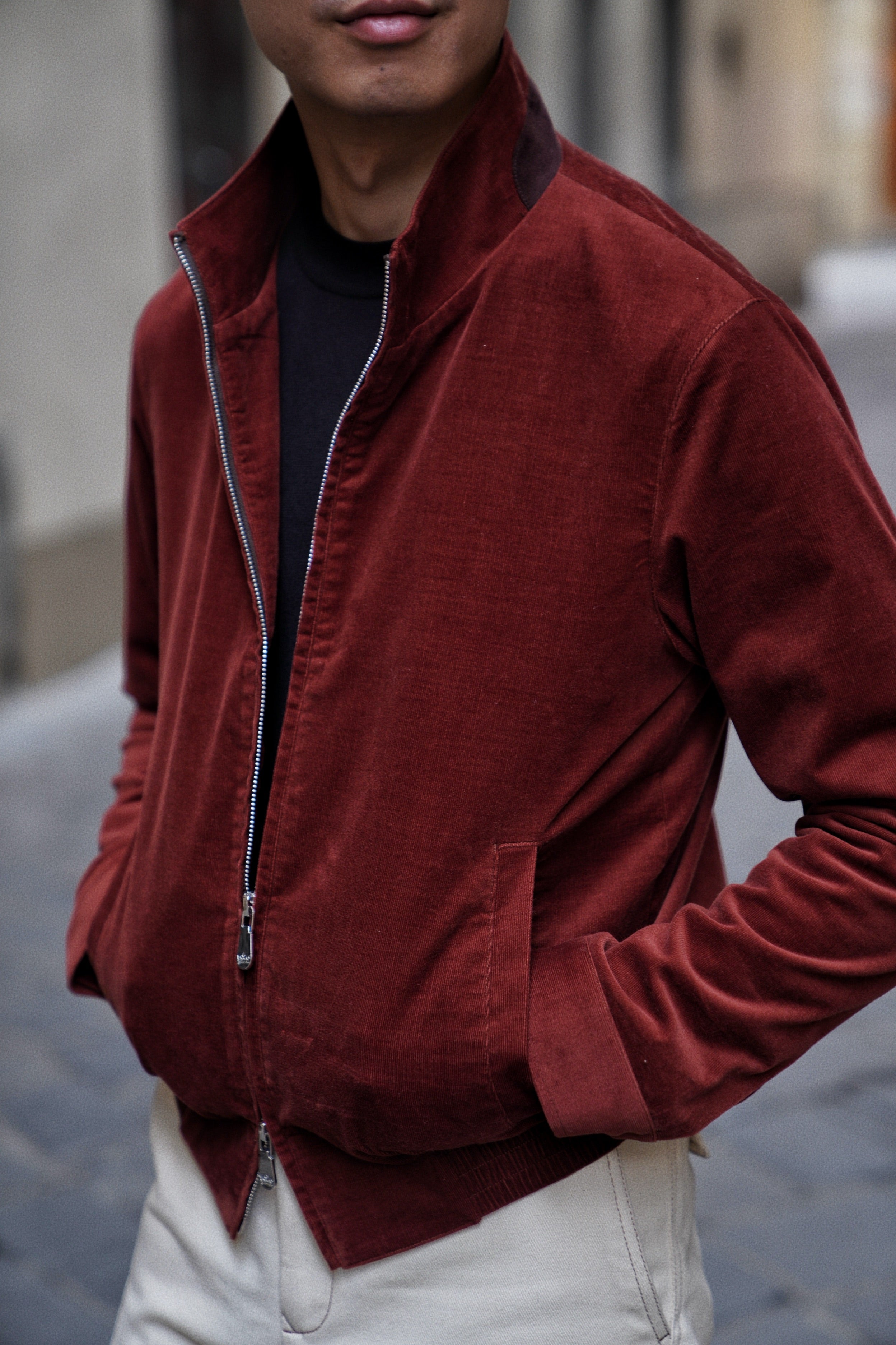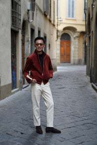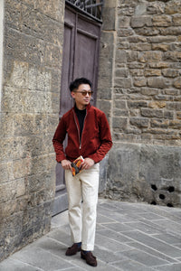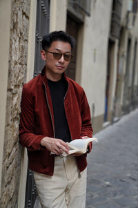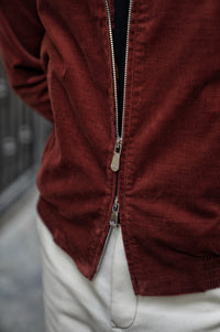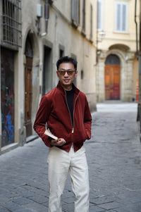 Bathed in the rich, earthy glow of Sienna, this bomber jacket is a tribute to the warmth of the Tuscan landscape. Crafted from the legendary corduroy of Solbiati, the fabric possesses a velvety depth and a subtle luster that can only be achieved through generations of Italian expertise. The Sienna hue—a sophisticated, dark orange-red—functions as a bold neutral, adding a spirited pop of color to a winter wardrobe while remaining grounded in classic masculine style.