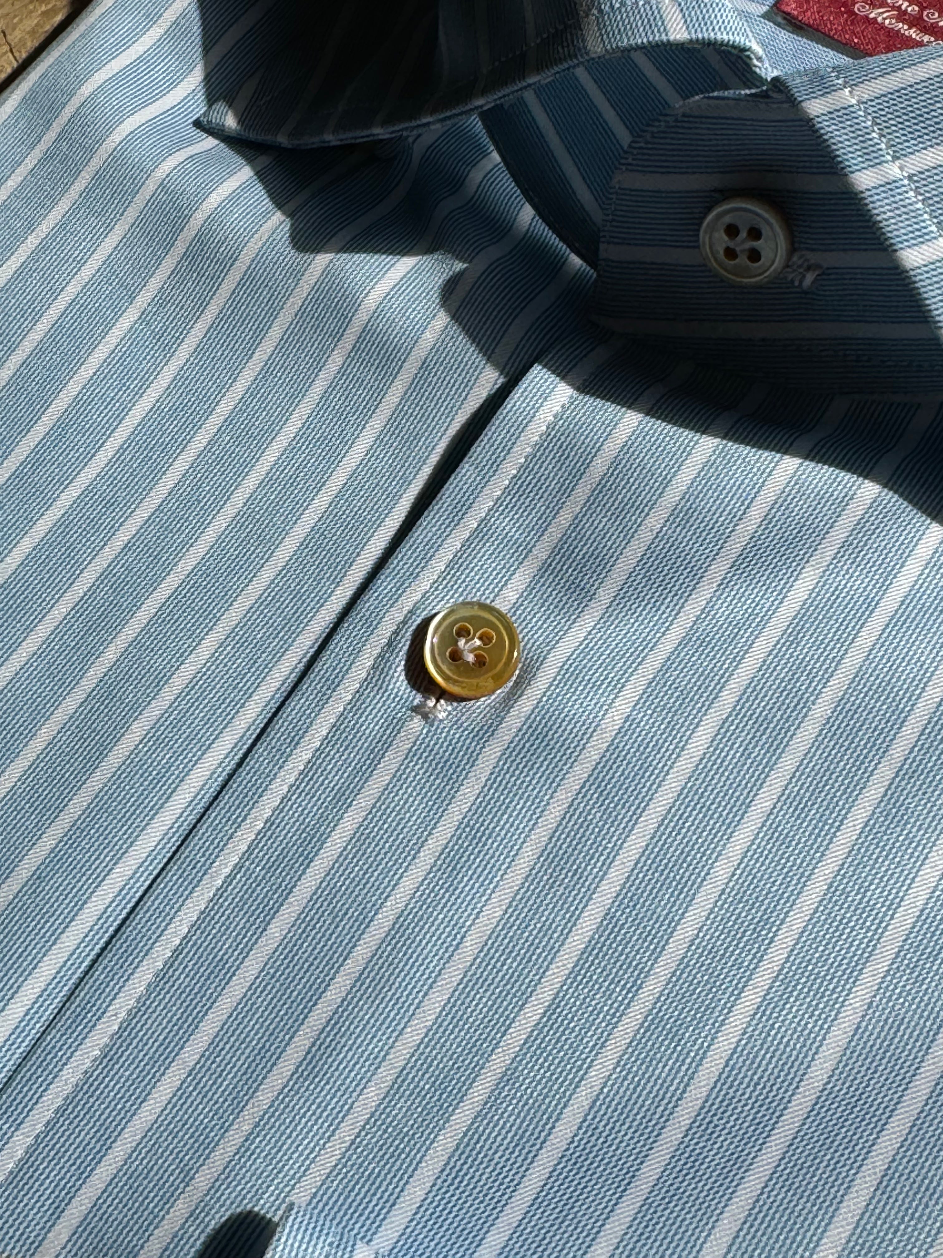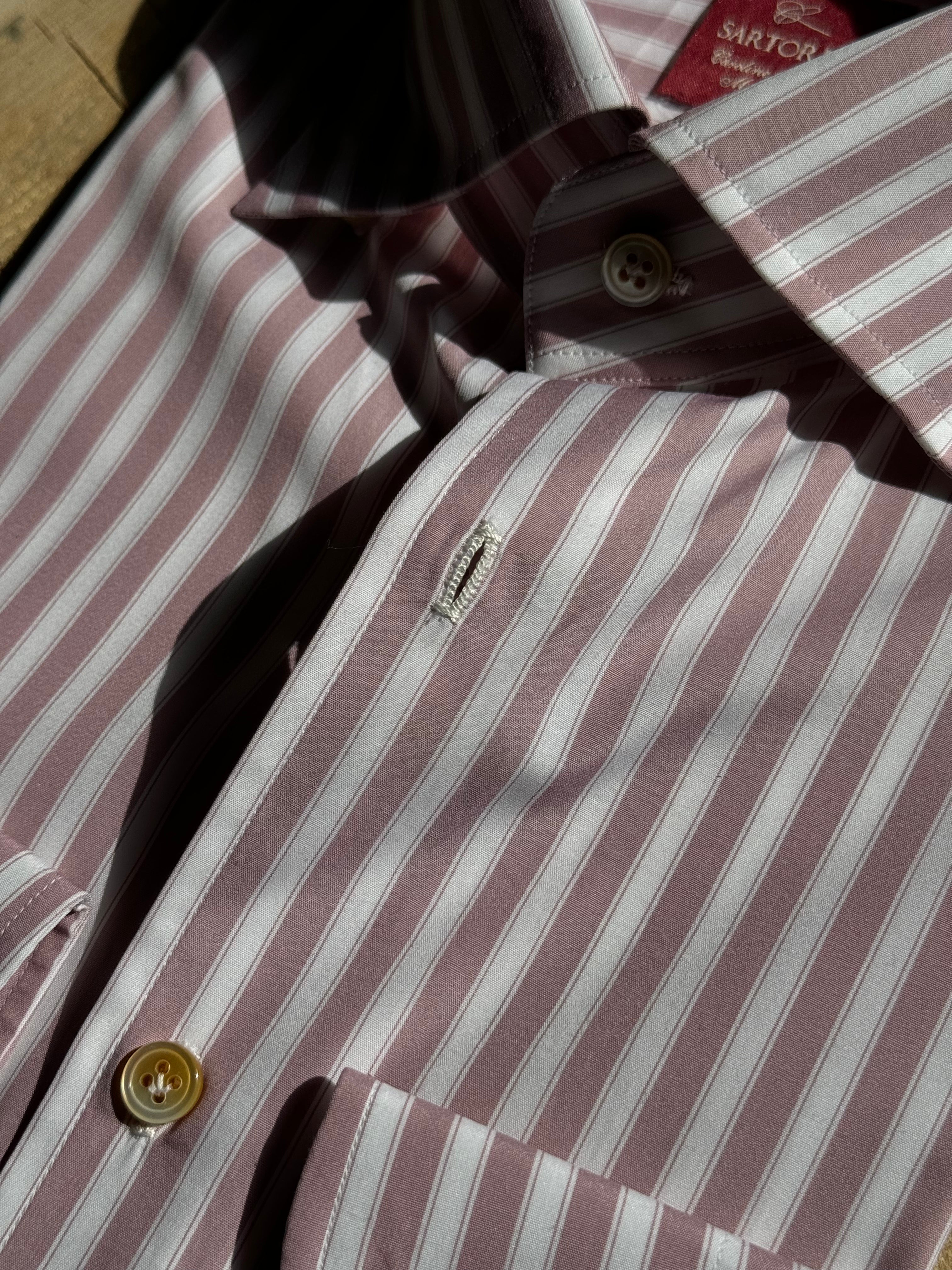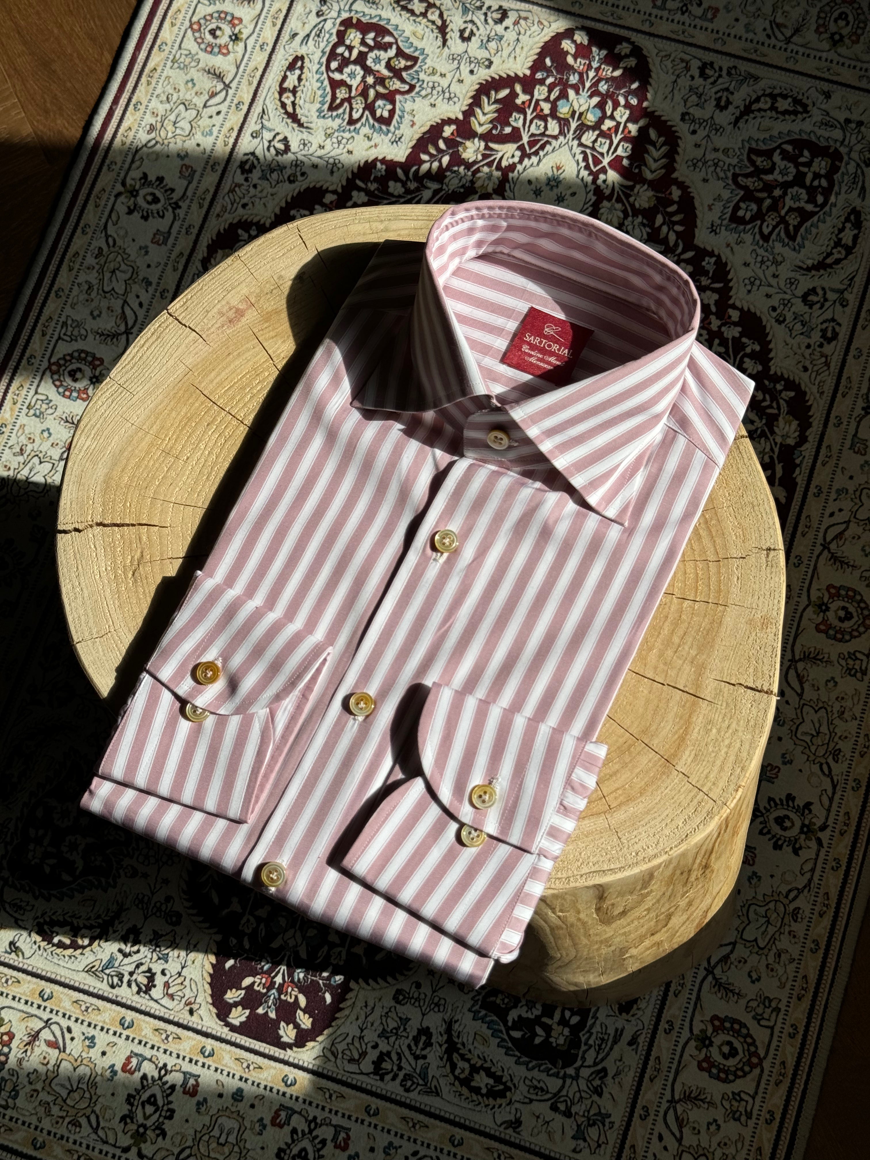 - The Hand-stitched Stripe Shirt crafted from Egyptian cotton by Albini is a paragon of artisanal craftsmanship. Every stitch is painstakingly placed by hand, imparting a distinct allure. The shirt comes in two charming colorways: a serene blue stripe and a lively pink stripe. These classic stripe patterns endow it with a timeless appearance, making it suitable for any occasion.