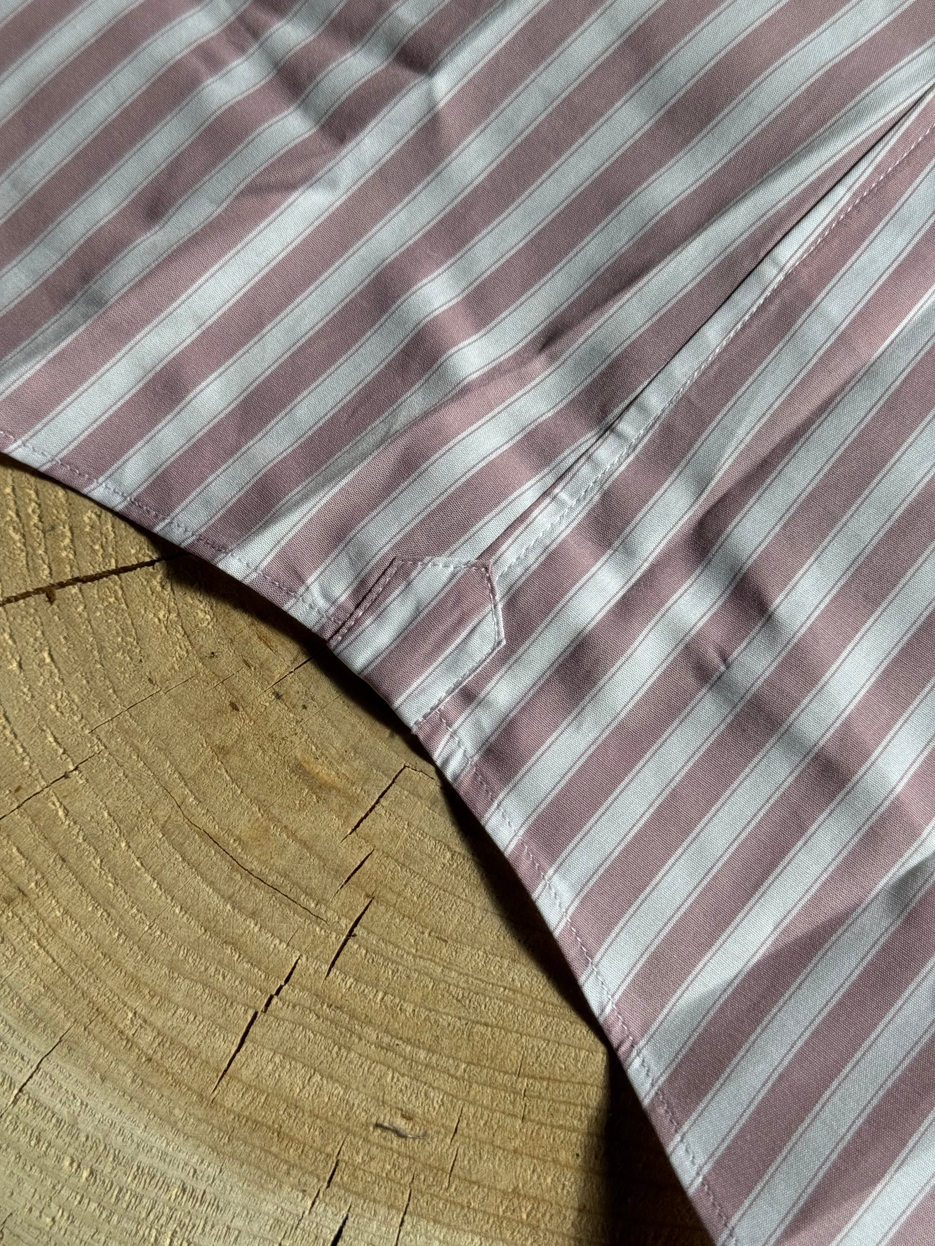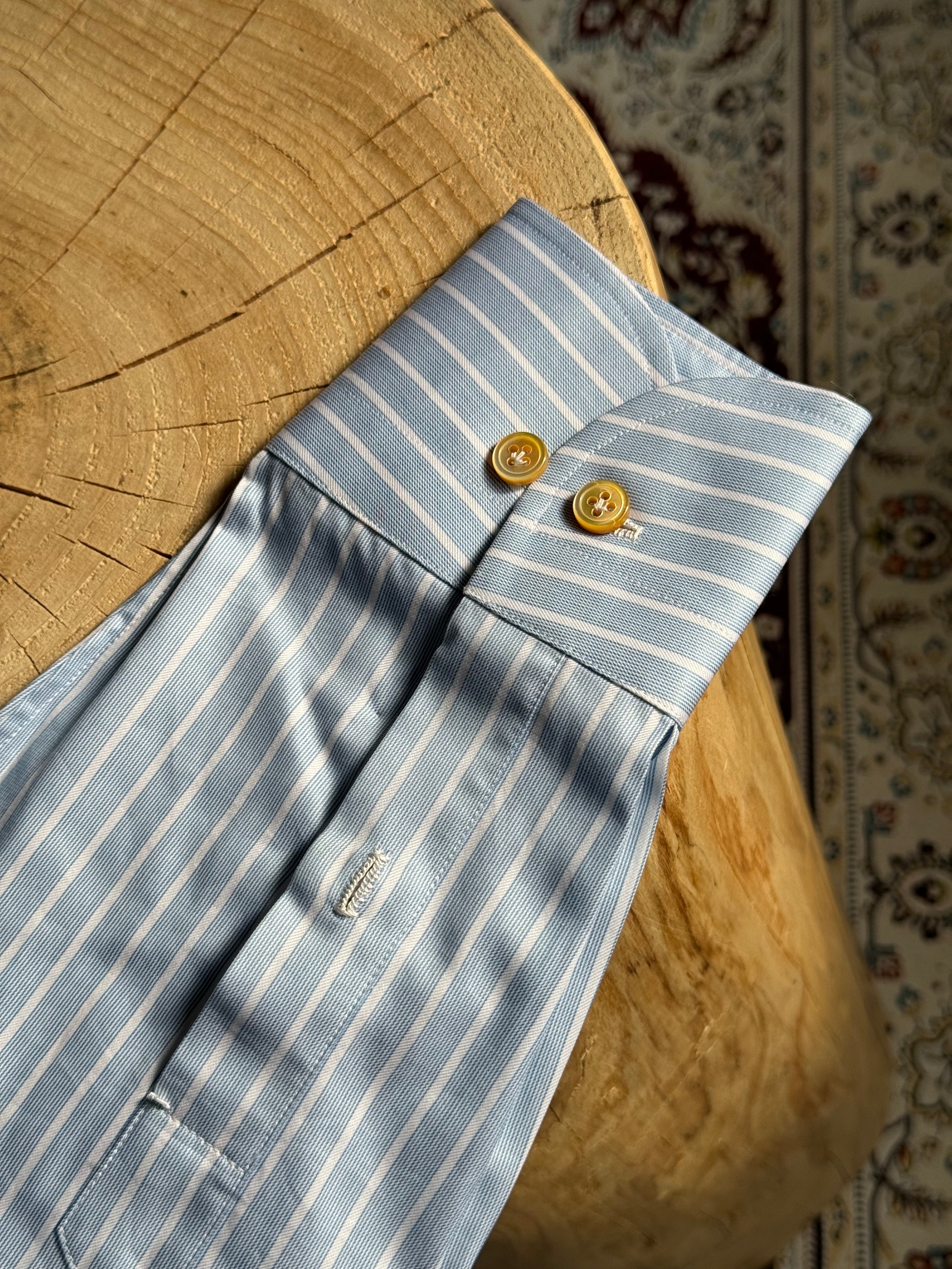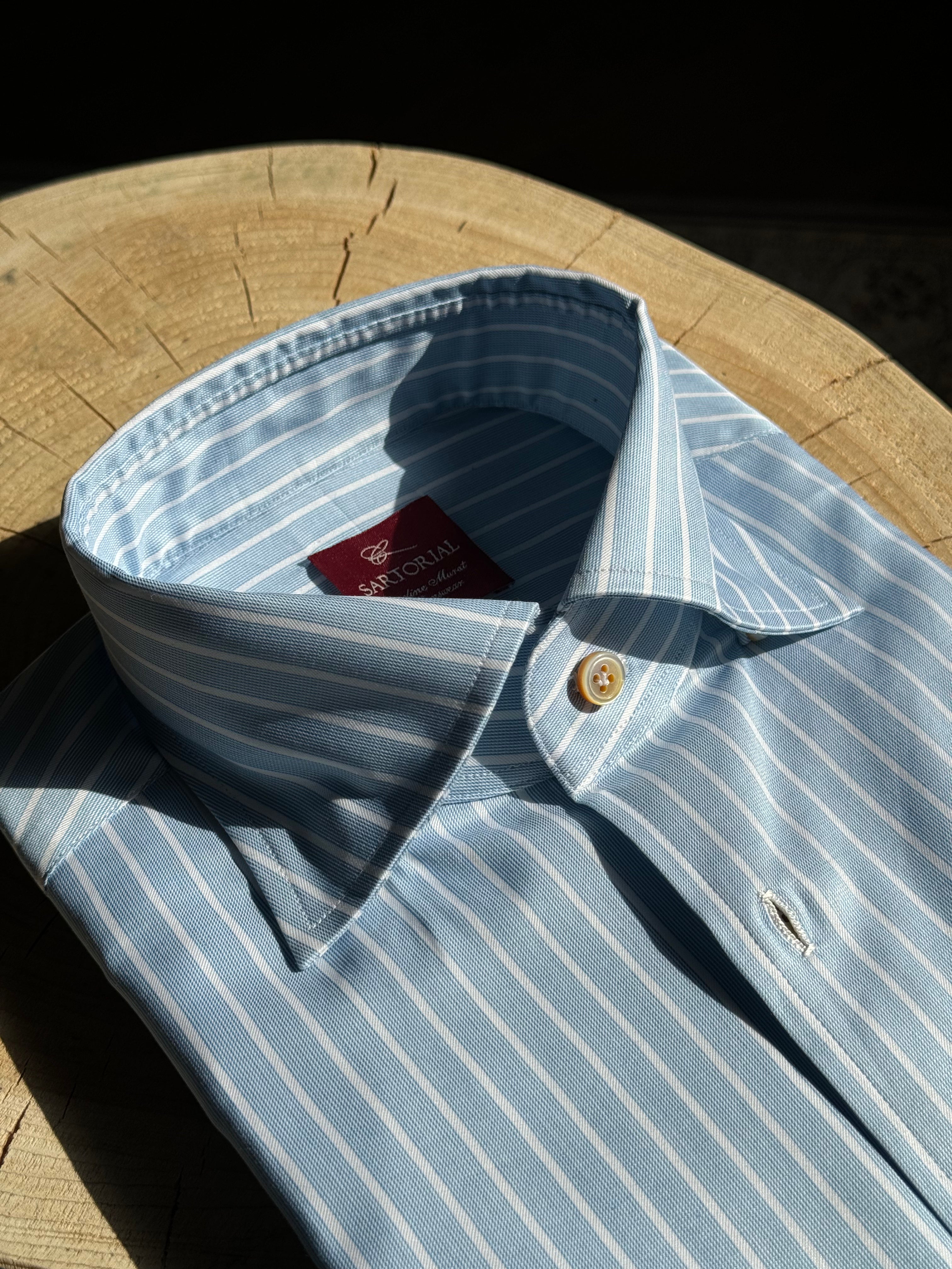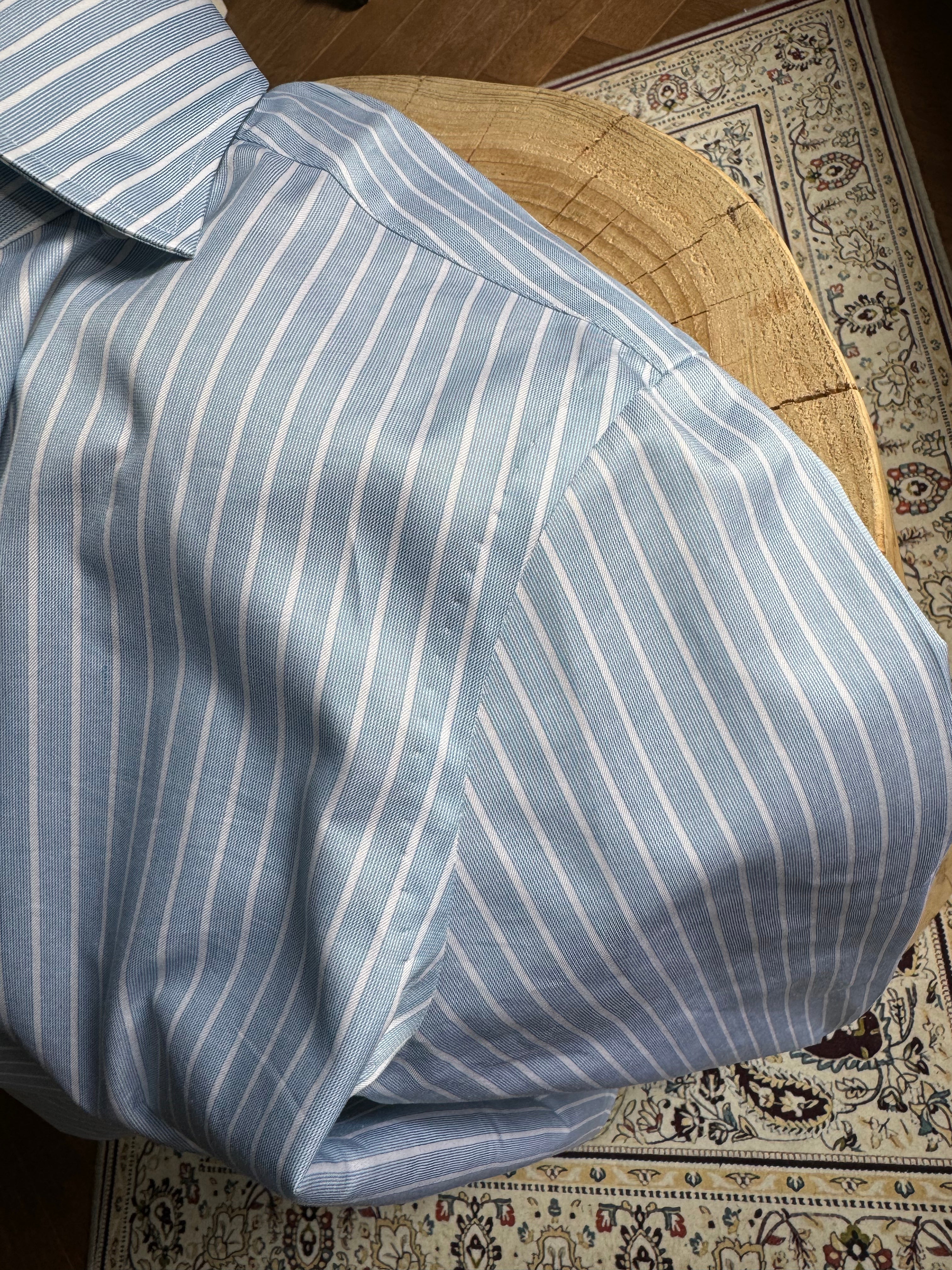- The Hand-stitched Stripe Shirt crafted from Egyptian cotton by Albini is a paragon of artisanal craftsmanship. Every stitch is painstakingly placed by hand, imparting a distinct allure. The shirt comes in two charming colorways: a serene blue stripe and a lively pink stripe. These classic stripe patterns endow it with a timeless appearance, making it suitable for any occasion.