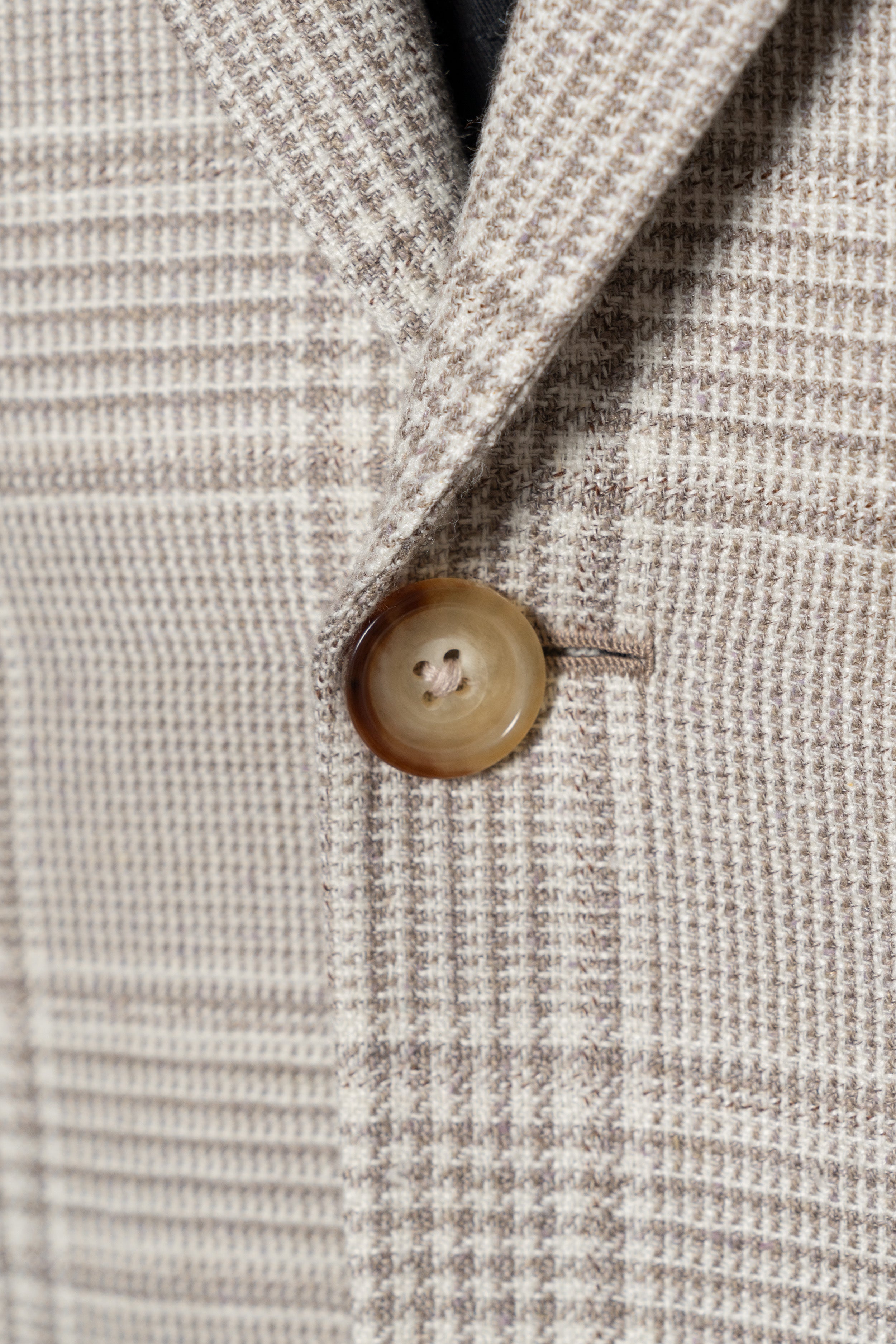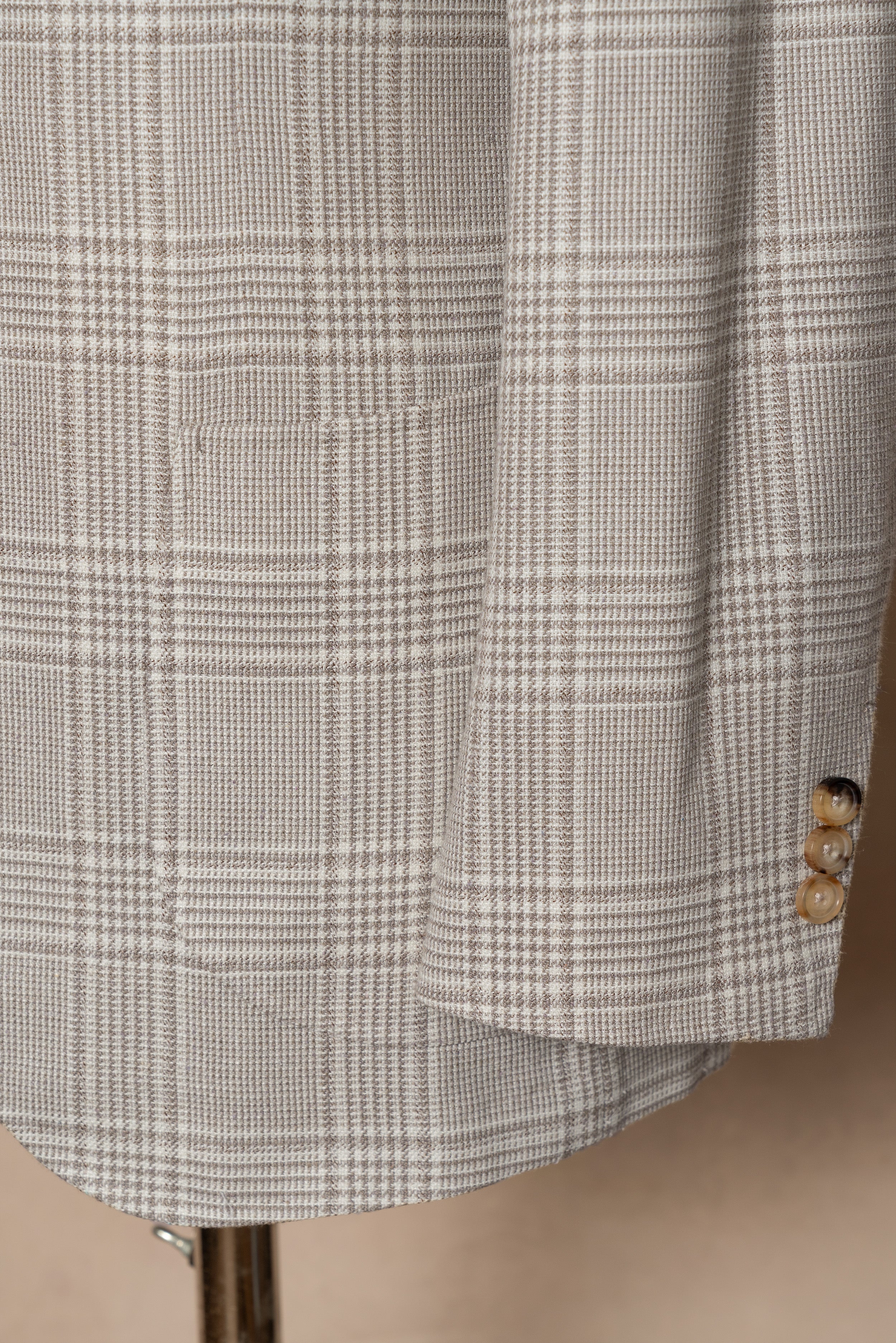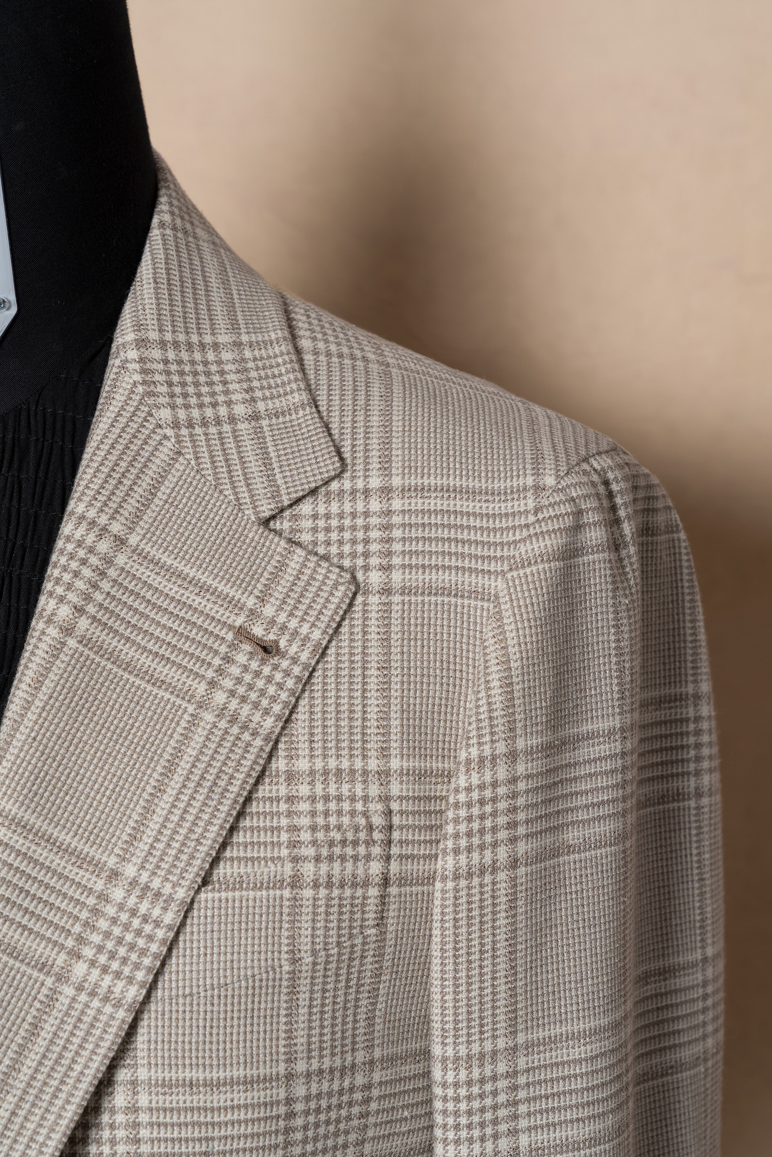 Woven from a breathable blend of wool, silk, and linen, this Beige Glen Check Jacket offers a refined take on classic tailoring. The soft beige base is accented with a subtle check pattern, adding depth without overpowering. Lightweight and textured, it’s perfect for spring and summer occasions where effortless sophistication is key.