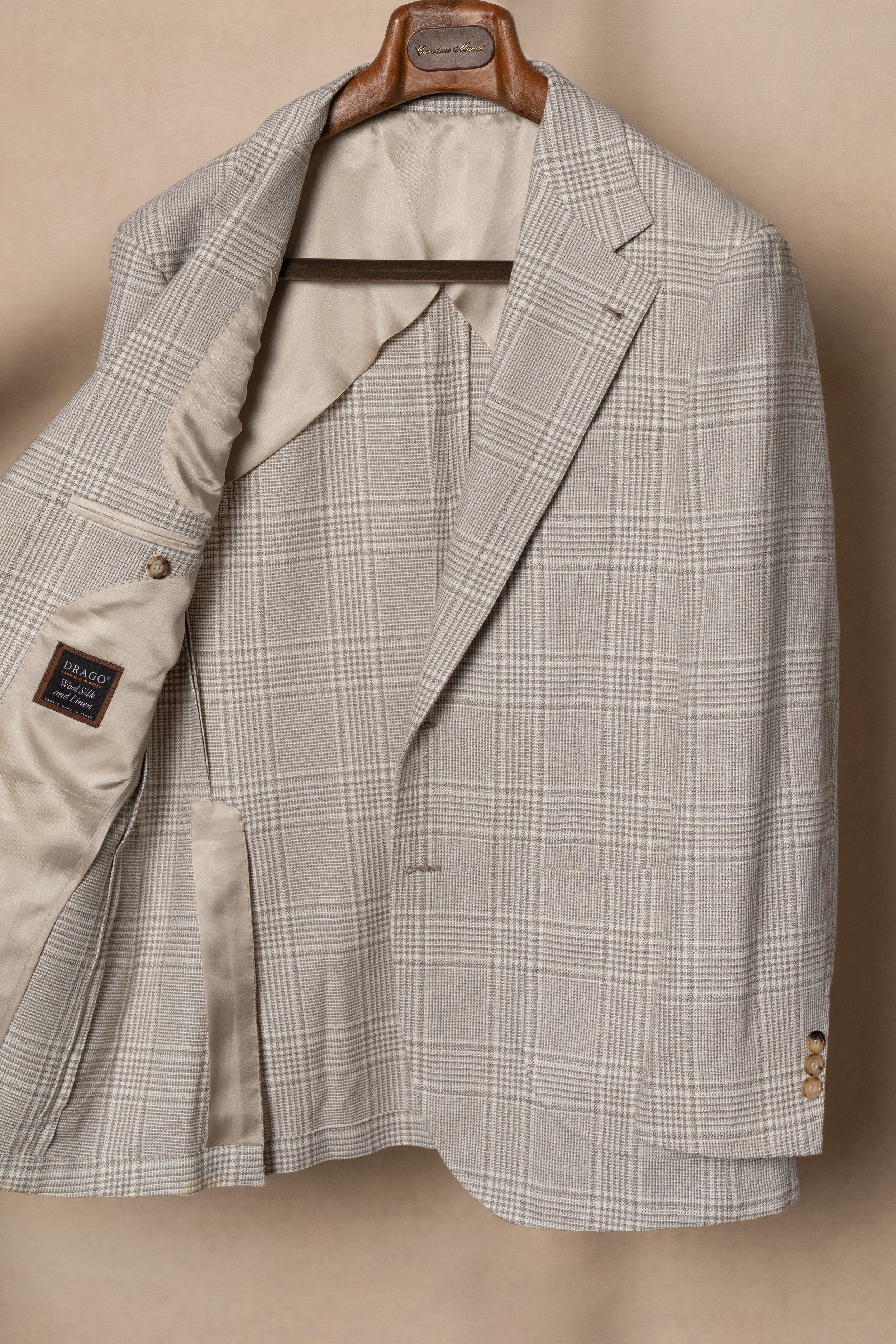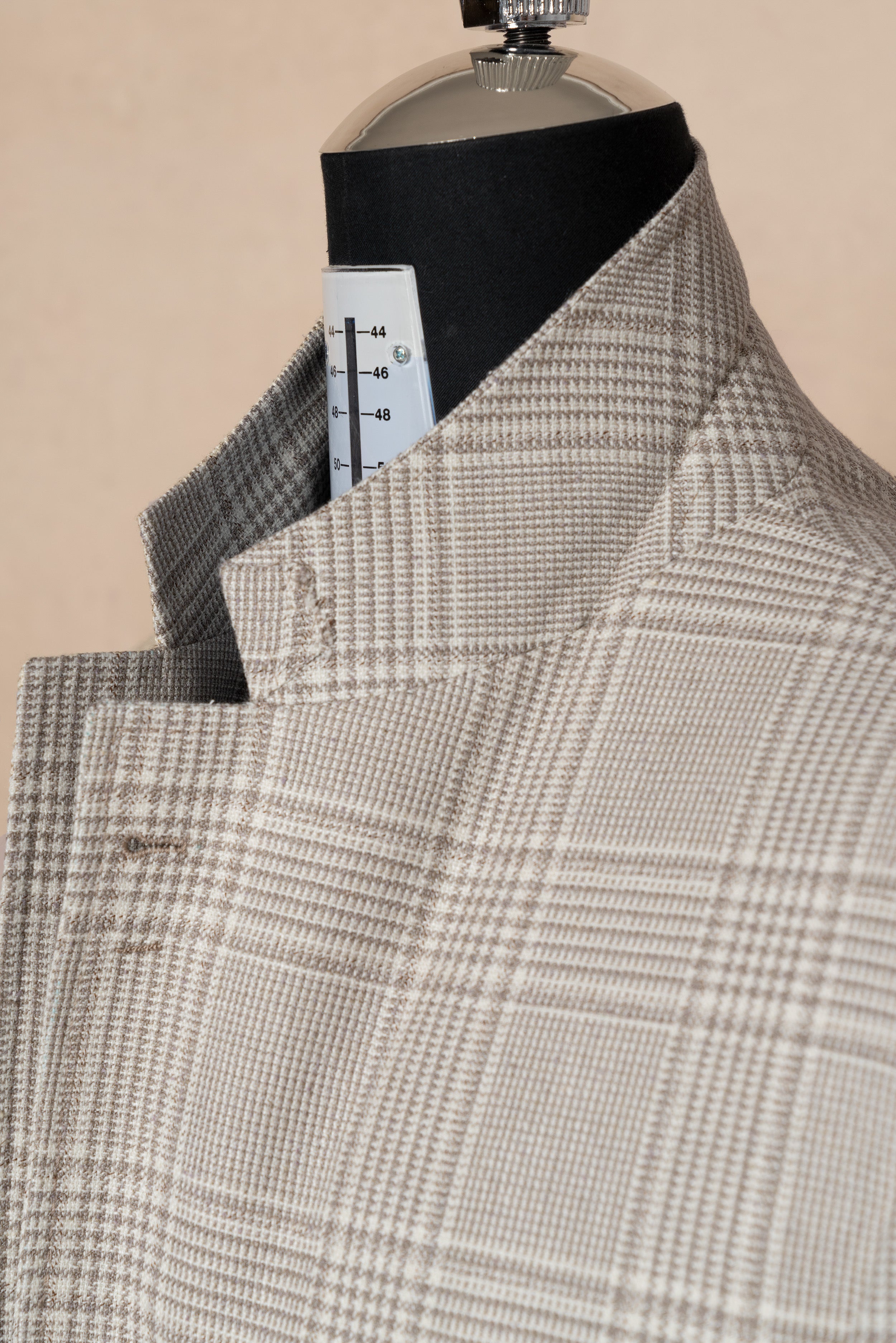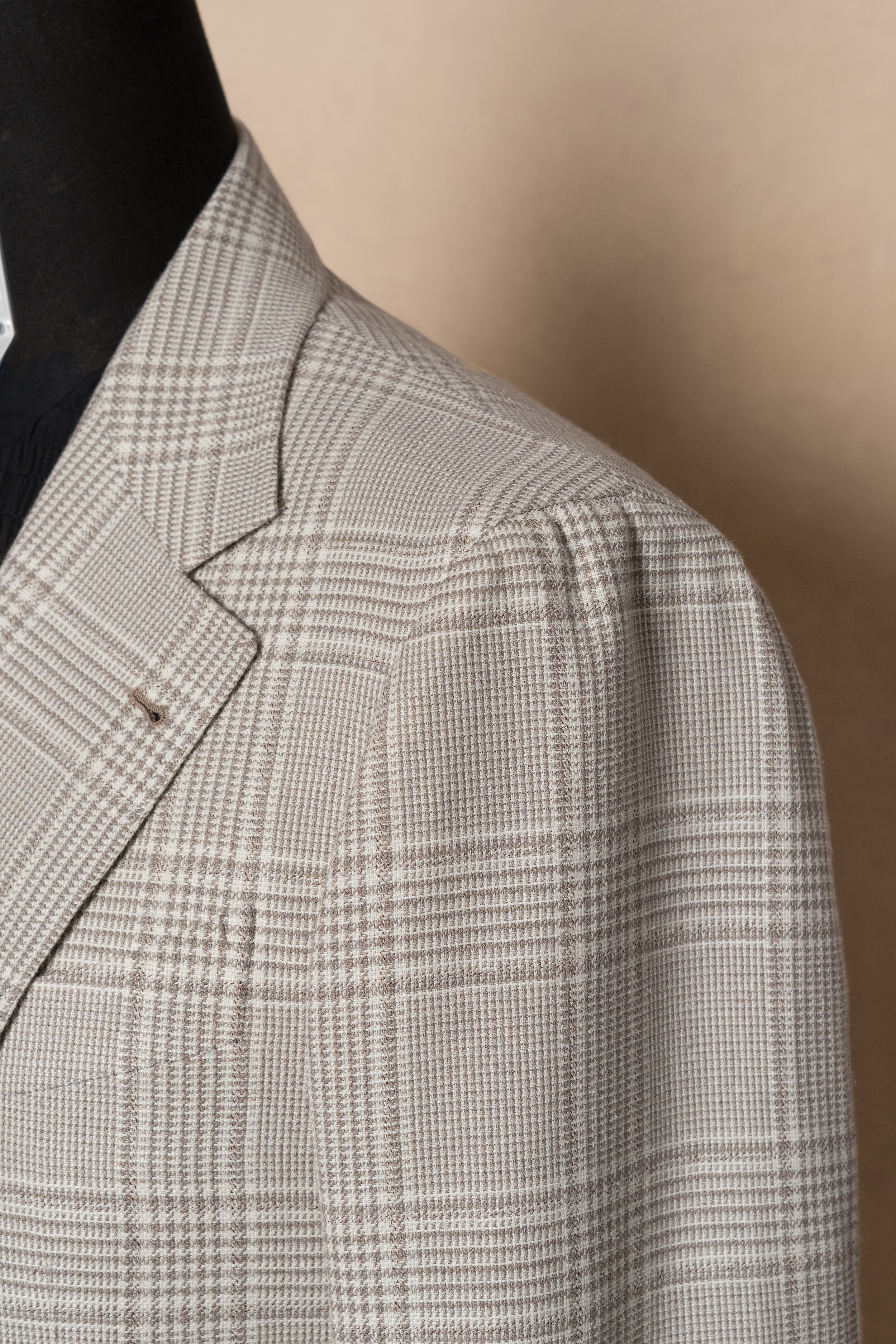 Woven from a breathable blend of wool, silk, and linen, this Beige Glen Check Jacket offers a refined take on classic tailoring. The soft beige base is accented with a subtle check pattern, adding depth without overpowering. Lightweight and textured, it’s perfect for spring and summer occasions where effortless sophistication is key.