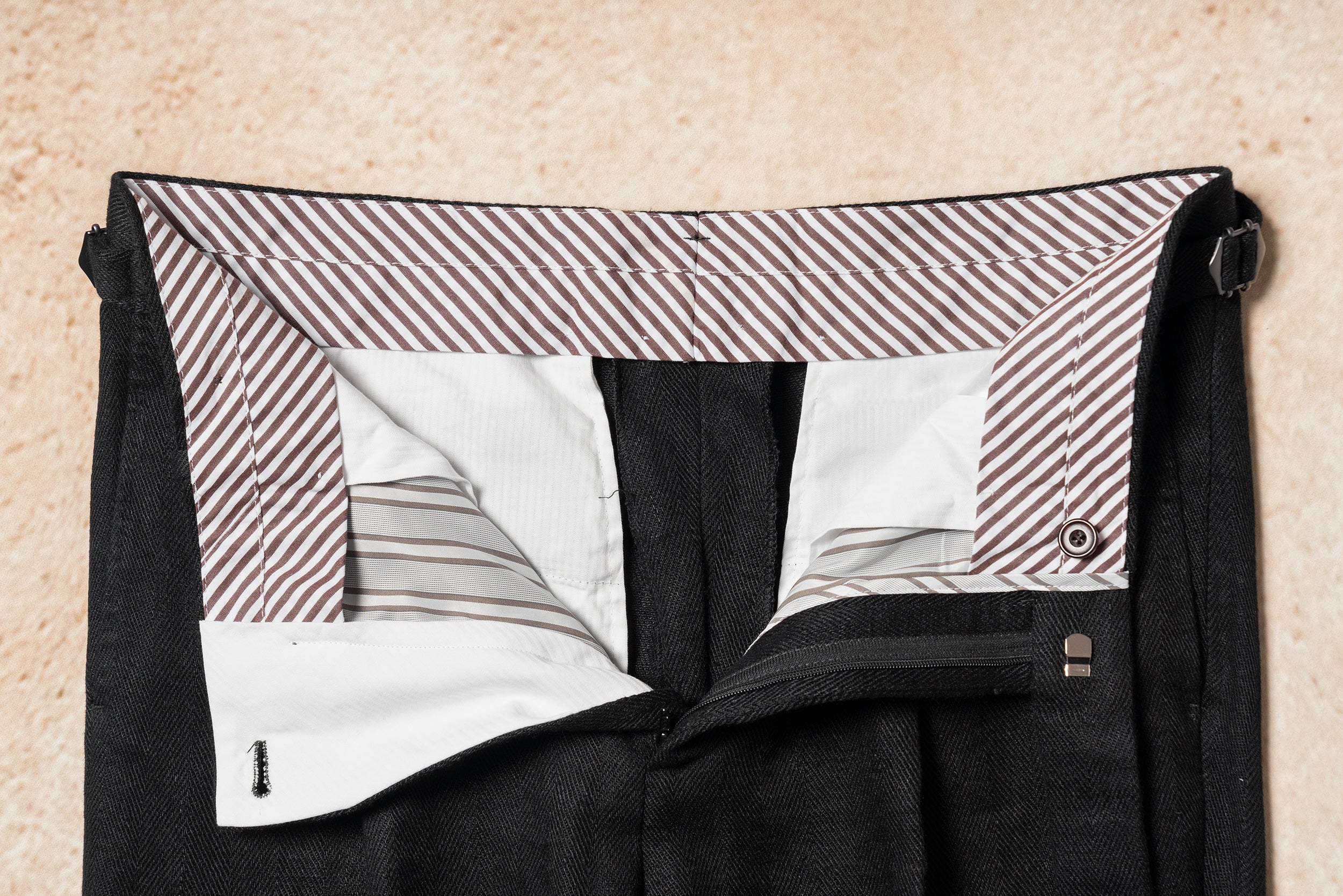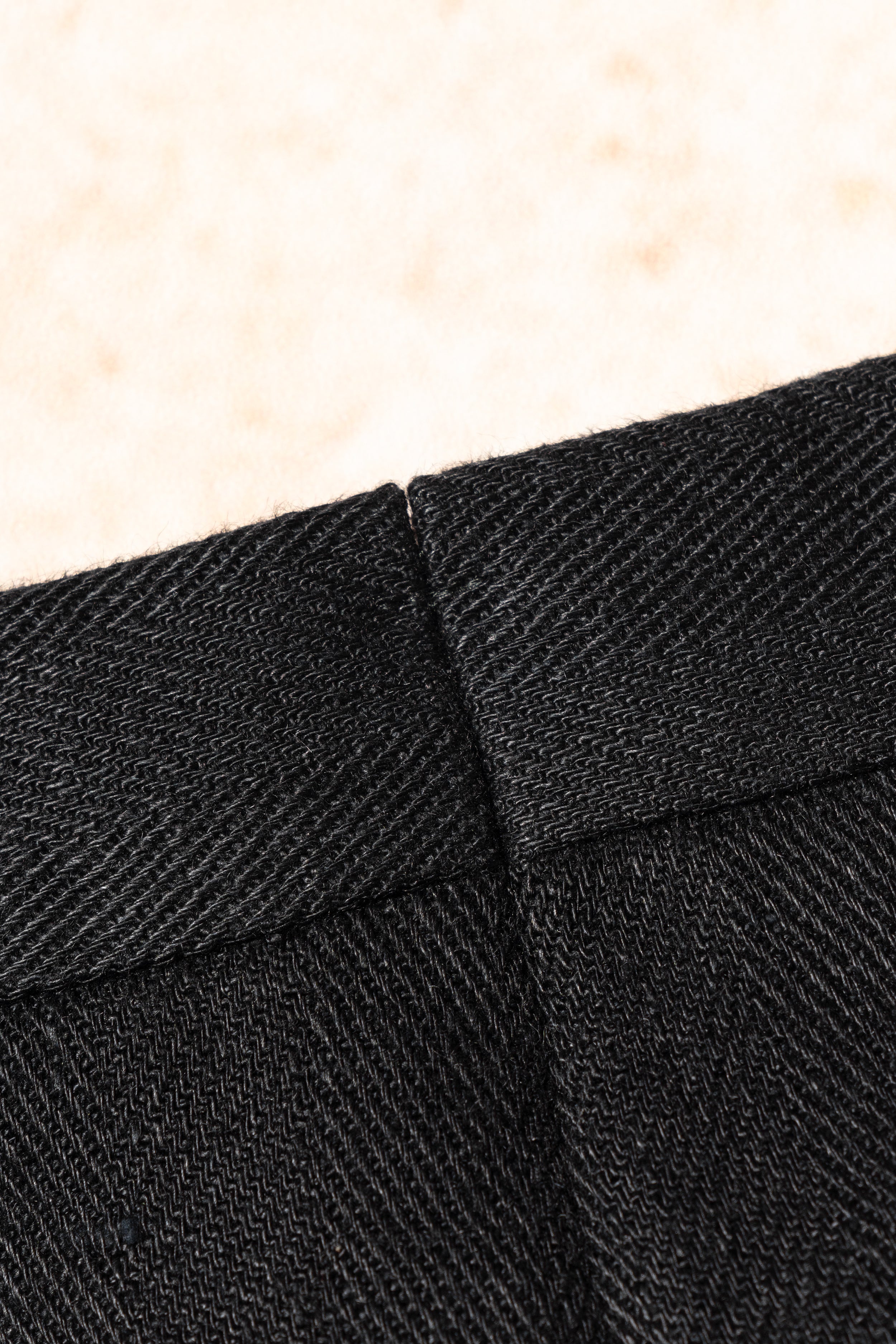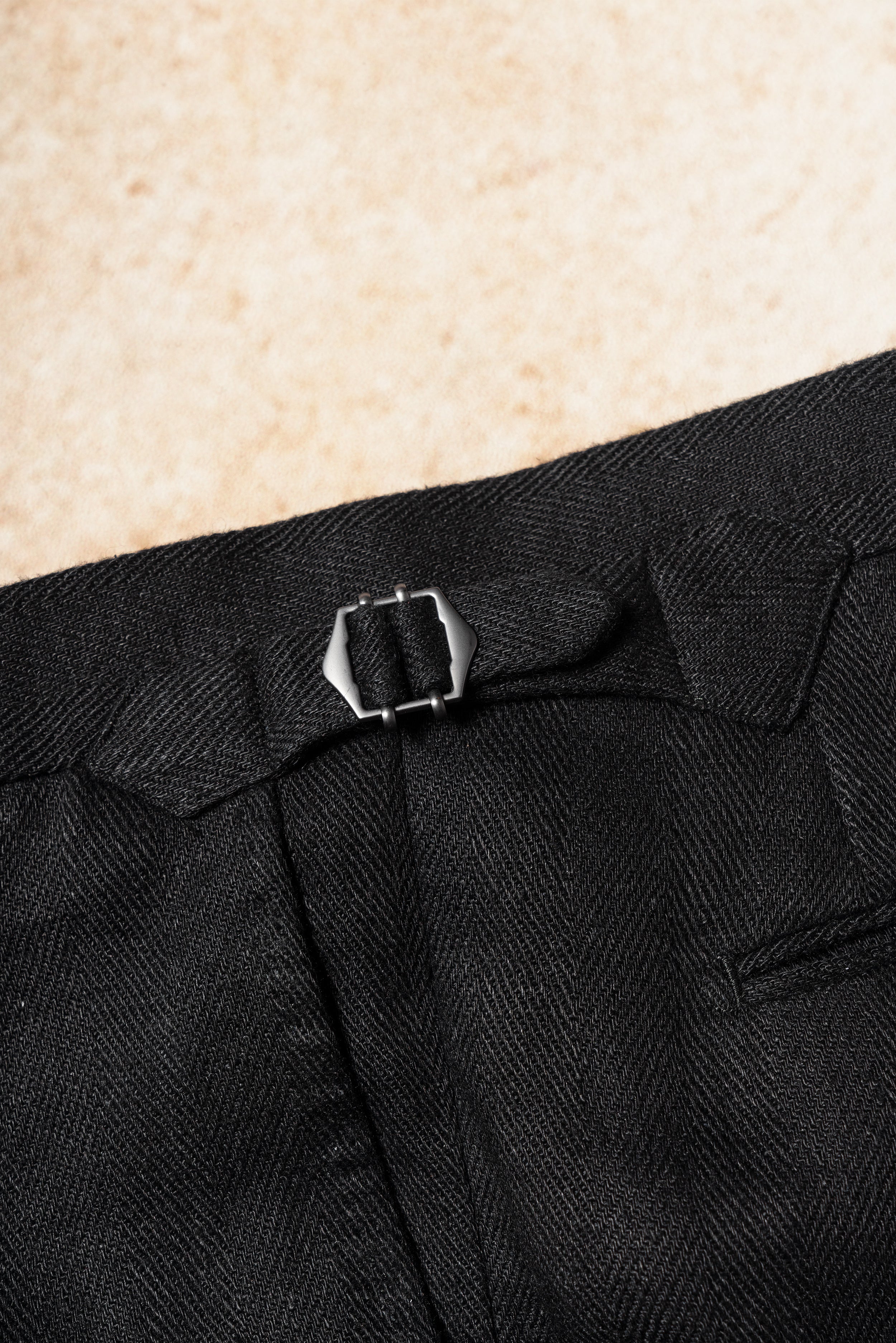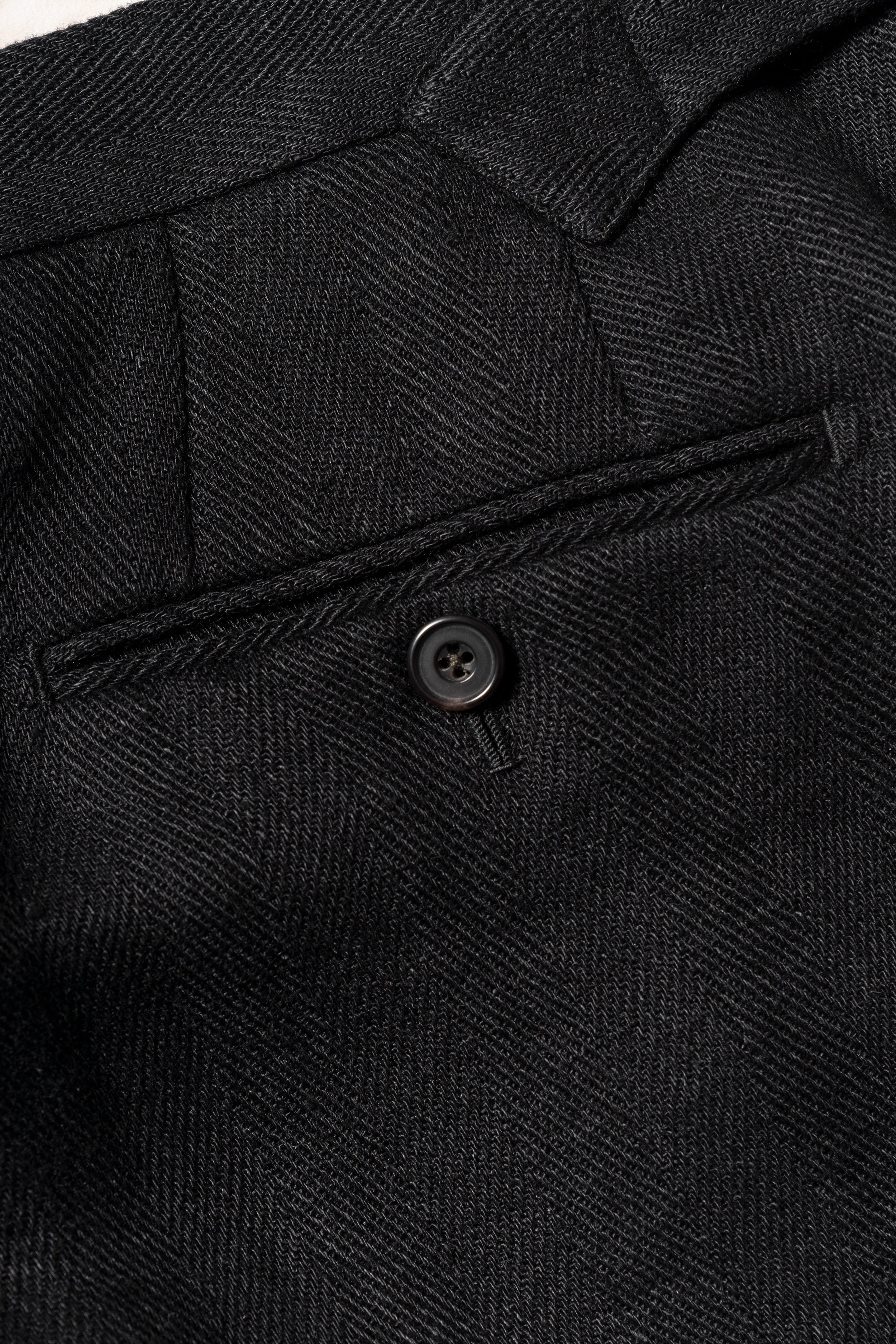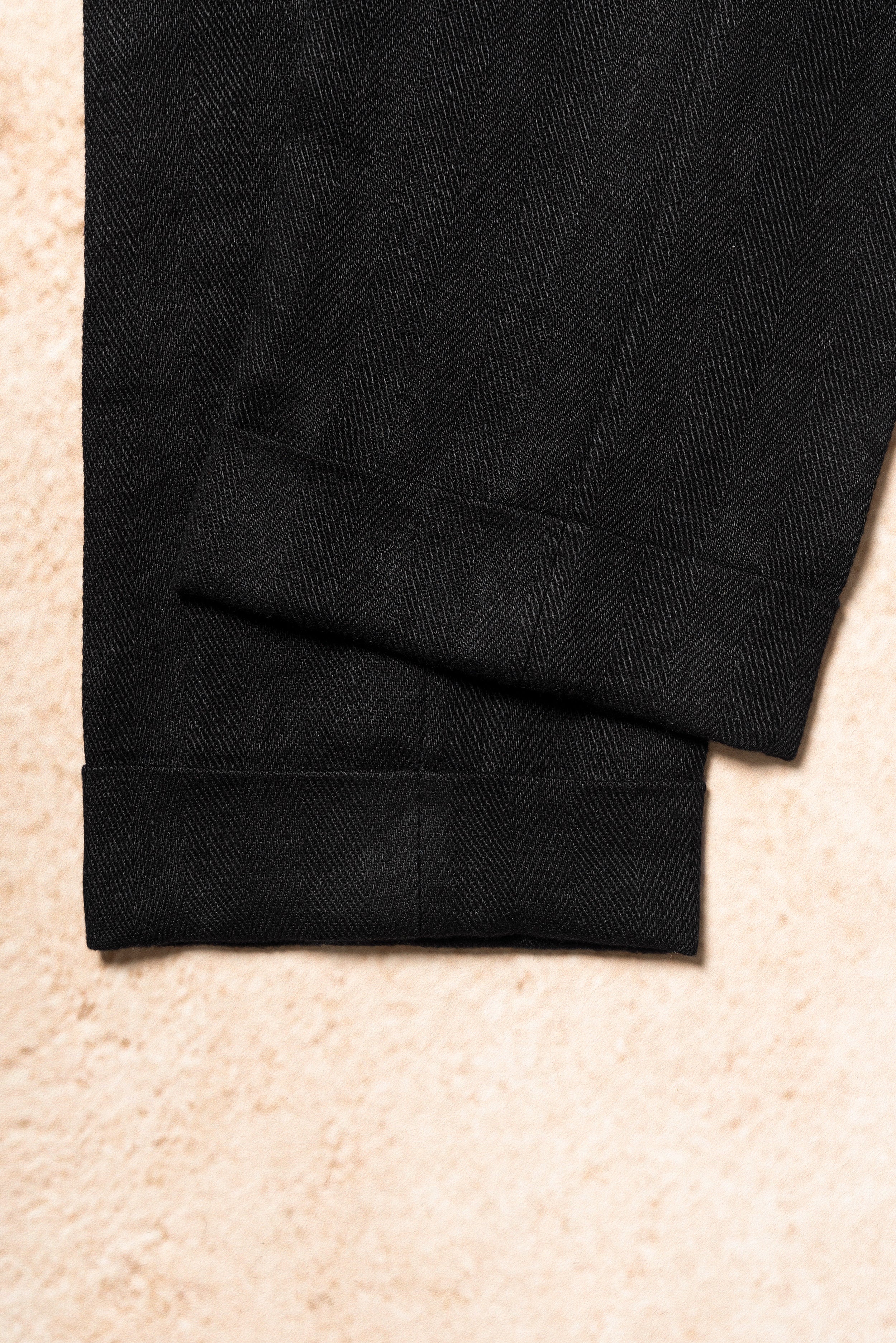 These black linen herringbone trousers offer a refined take on warm-weather tailoring. The subtle herringbone weave adds depth and texture, while the breathable linen ensures comfort and ease. Cut with a clean, slightly tapered silhouette, they pair effortlessly with everything from casual shirting to unstructured jackets.