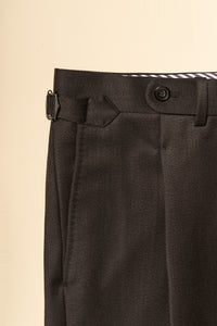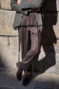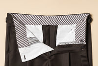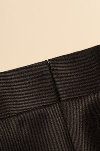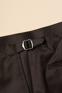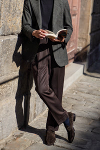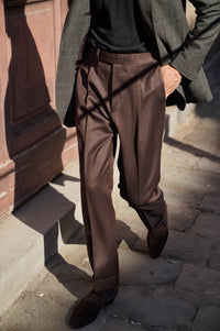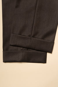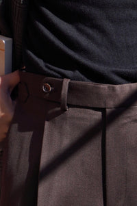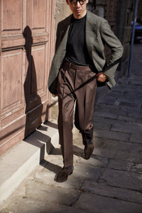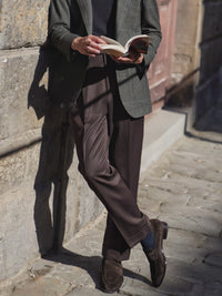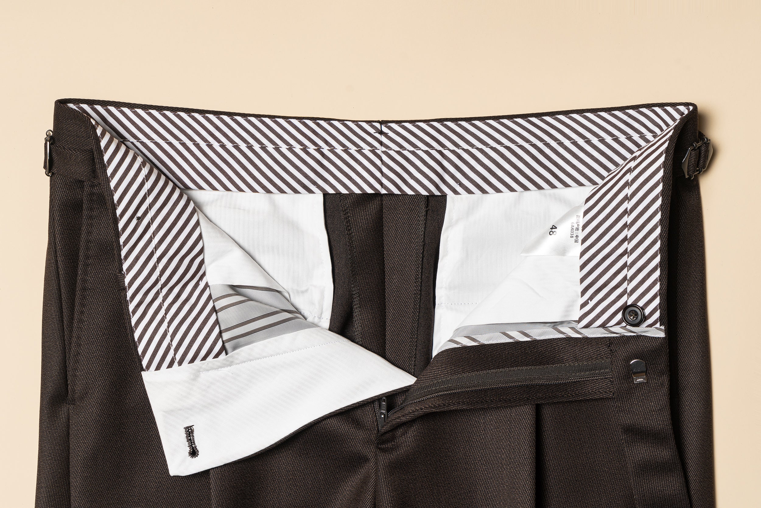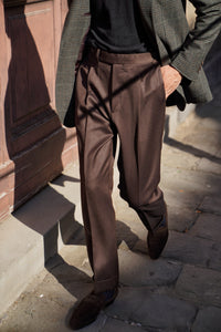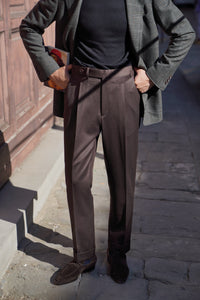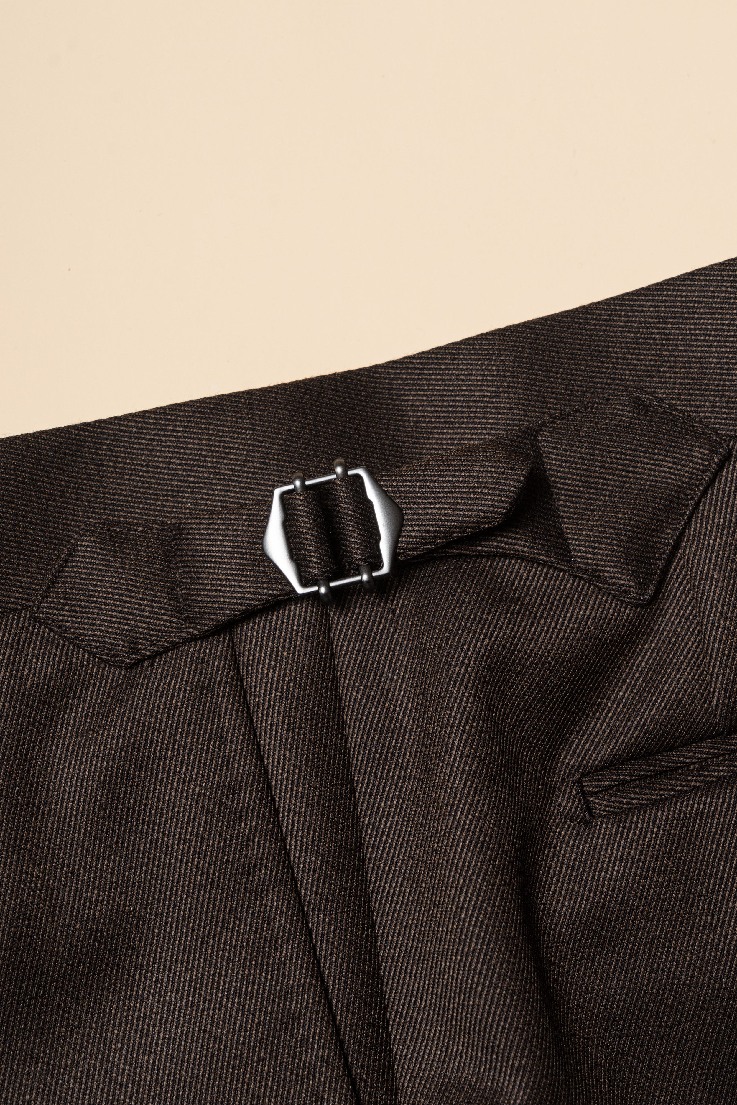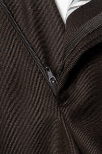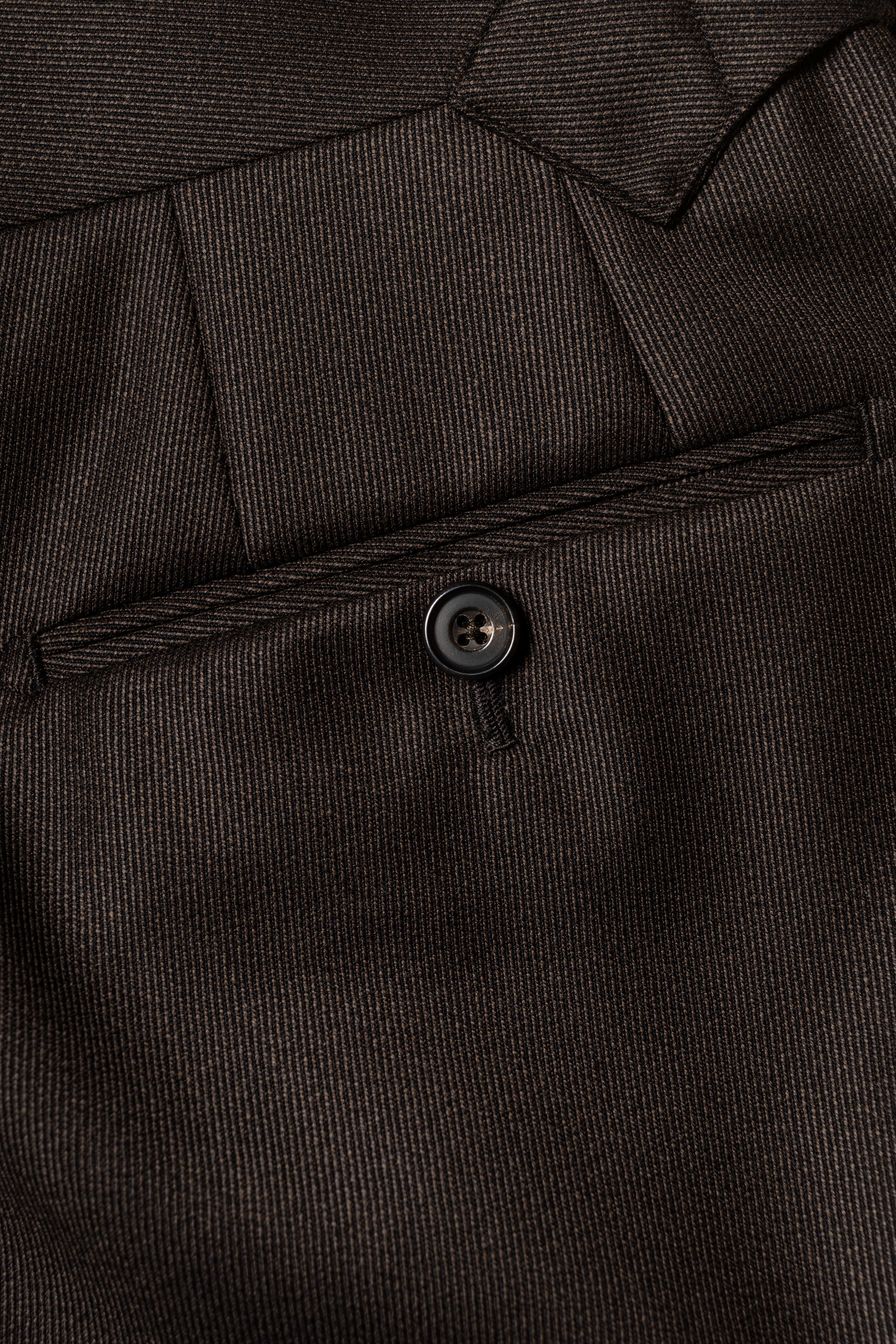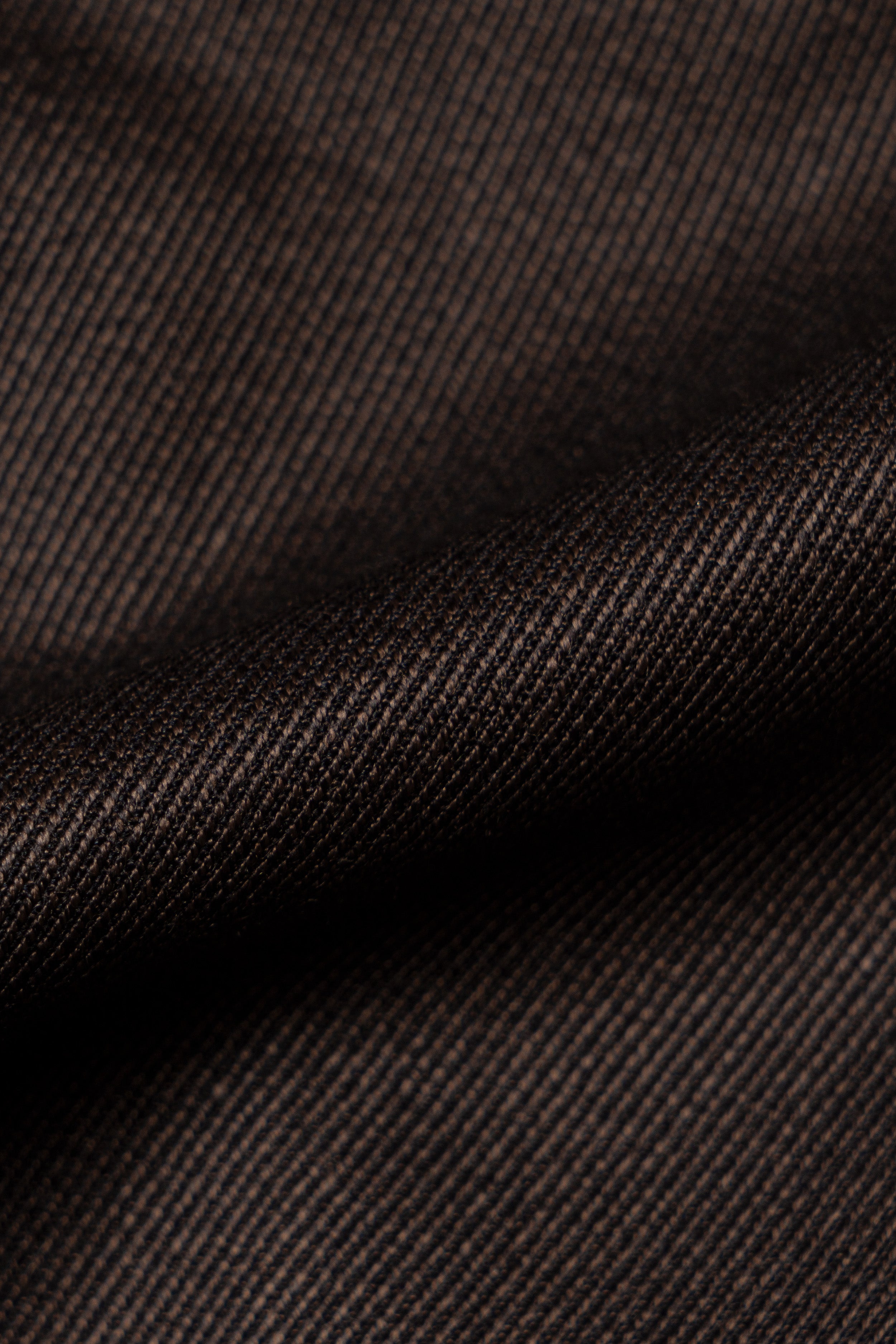 • The Dark Brown Wool Whipcord Trousers are a refined essential, tailored from robust wool whipcord that lends both structure and durability. The deep brown tone enhances their versatility, offering a sophisticated alternative to classic neutrals. With a clean, streamlined silhouette, they balance timeless tailoring with a subtle texture, making them ideal for pairing with both casual jackets and formal tailoring.