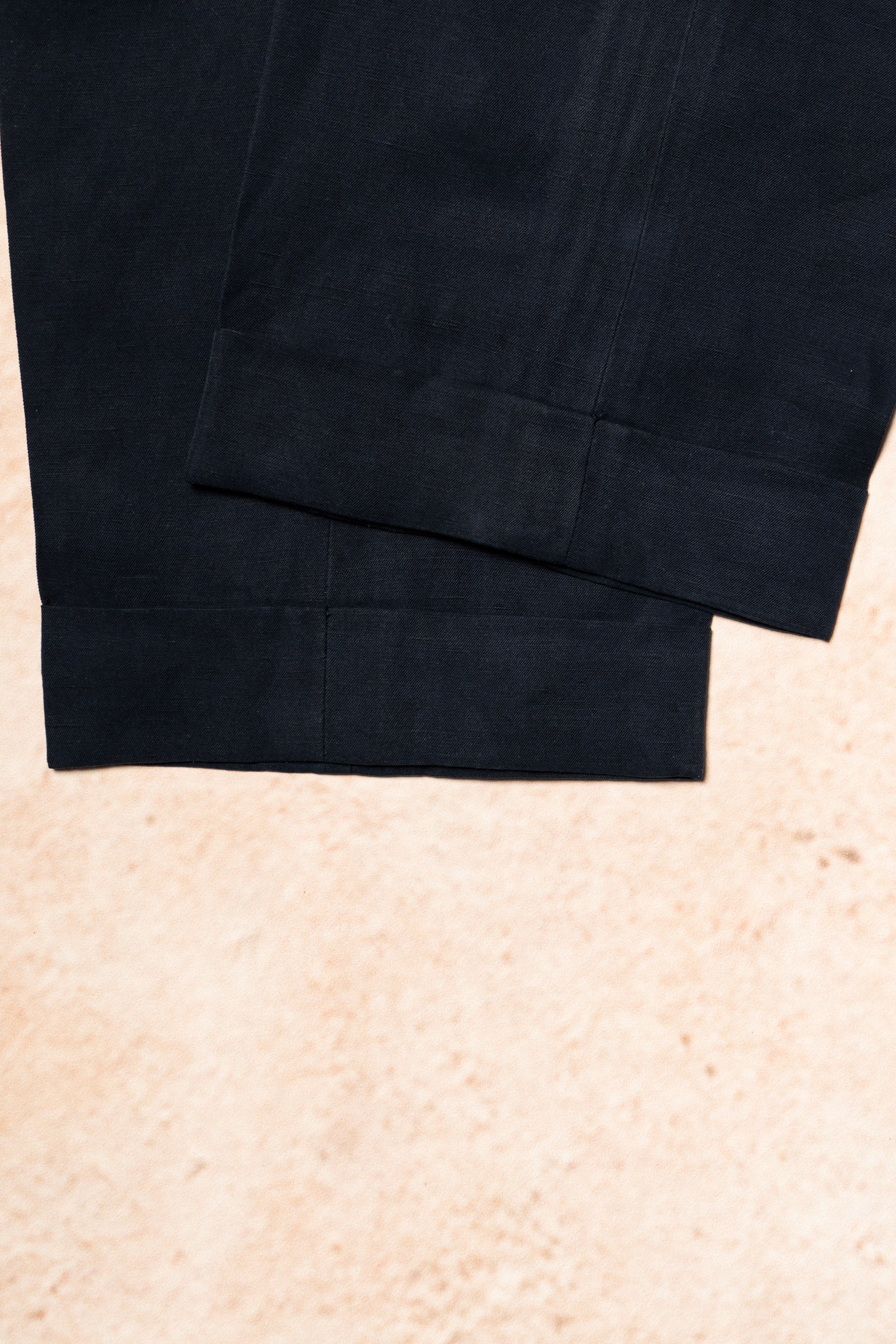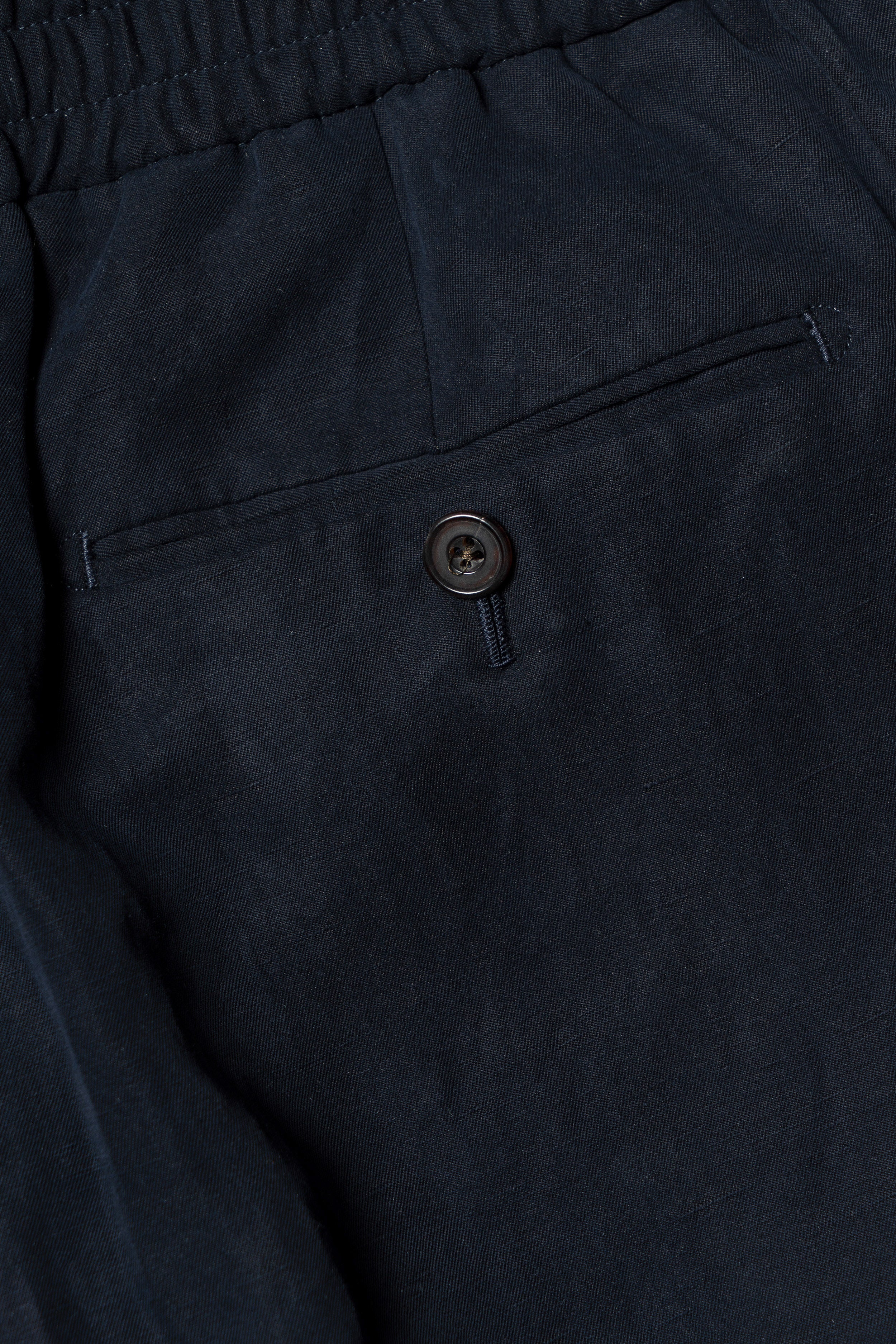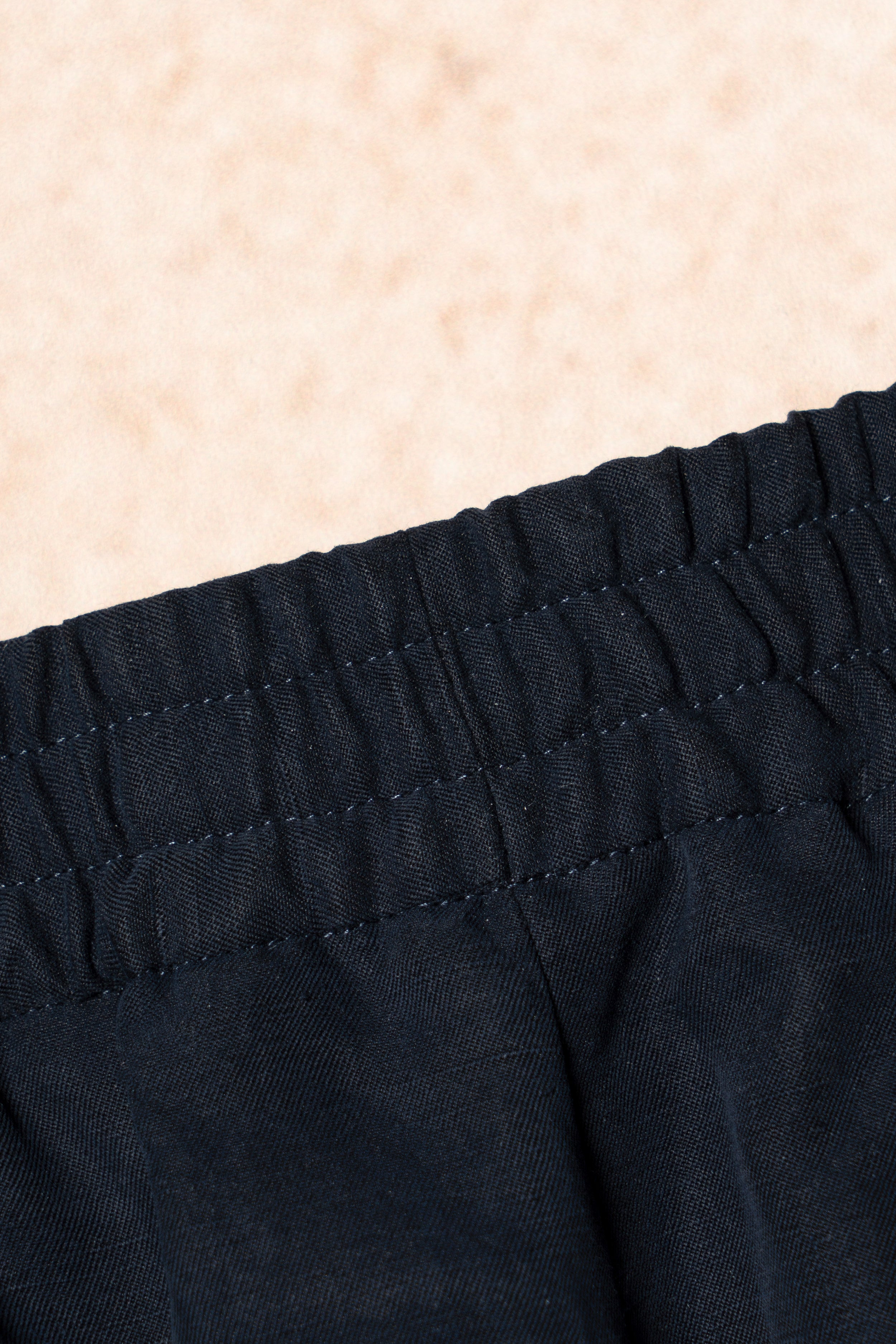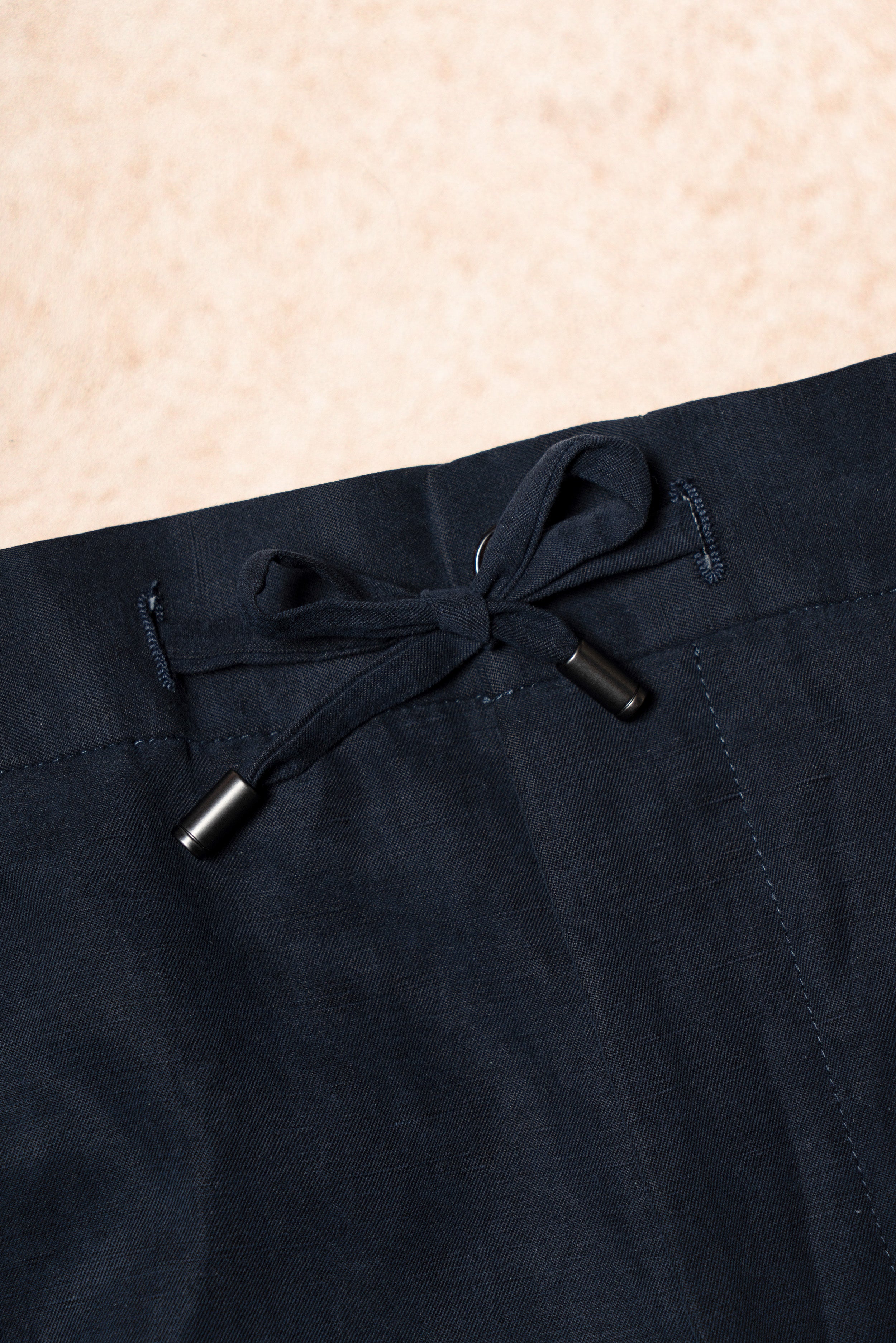 - The Navy Silk Linen Drawstring Trousers blend relaxed comfort with understated luxury. Made from a lightweight silk-linen fabric, they offer a breathable, fluid drape with a touch of natural sheen. The drawstring waist adds ease and versatility, making them ideal for effortless summer styling—equally at home with a casual tee or an unstructured blazer.